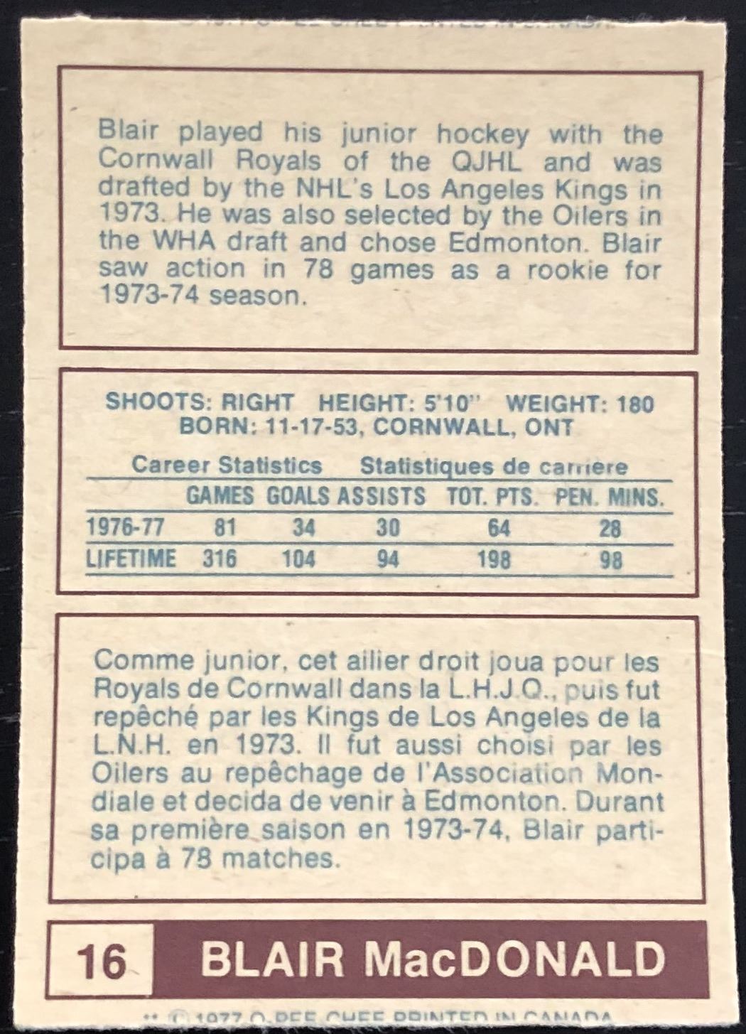 Card #16 hockey, WHA, vintage