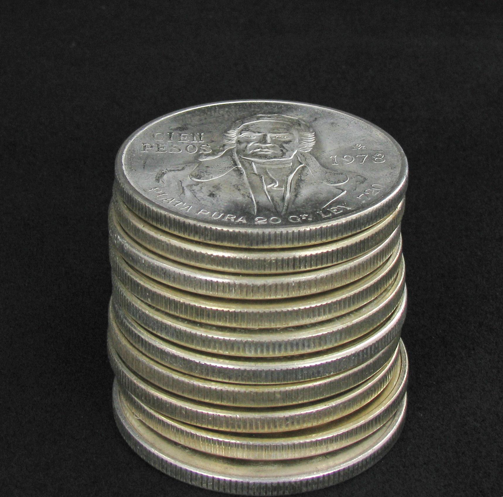 1977-9 Mexico Silver 100 Pesos Unsearched Stack of 10 Mostly BU 6.2 Ounces Silver! (COI-5232)
