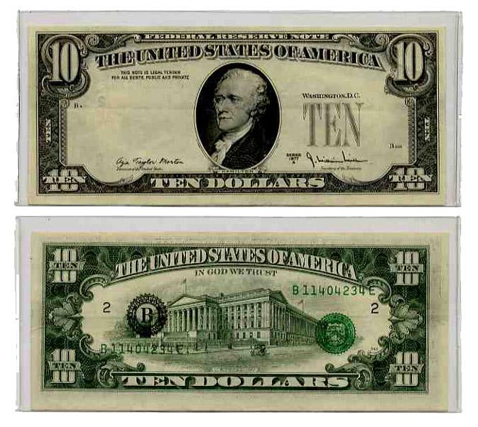 $10 Federal Reserve Error Note -- Series 1977-A, New York -- Serial Numbers & Treasury Seal Printed to Verso