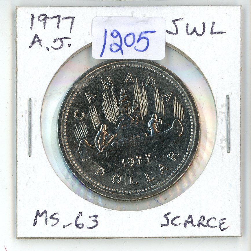 1977 Attached Jewels, Short Water Line in front of canoe Canadian Nickel Dollar. MS-63. Scarce.