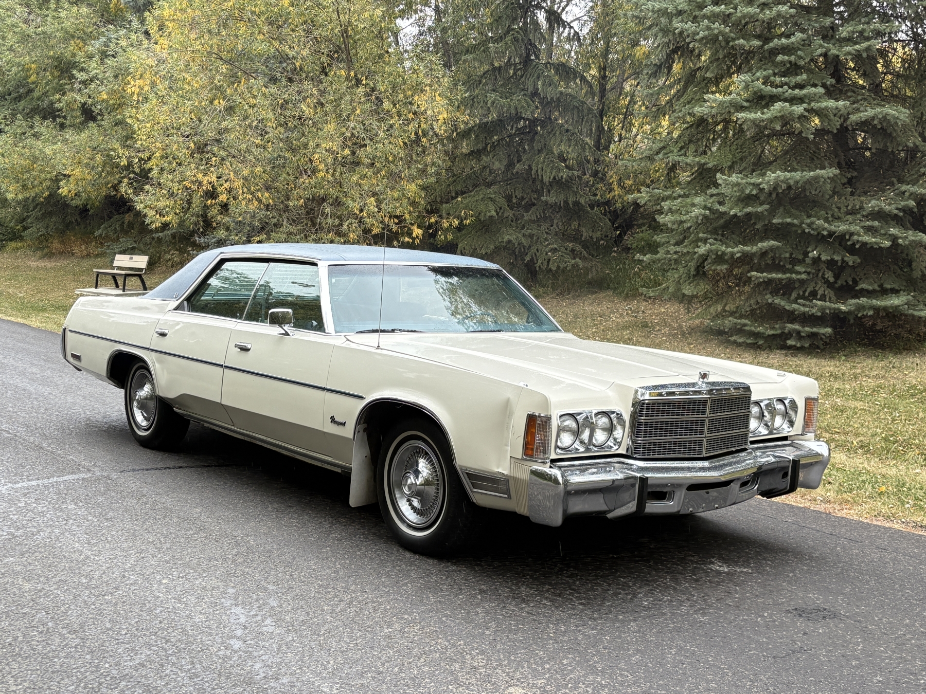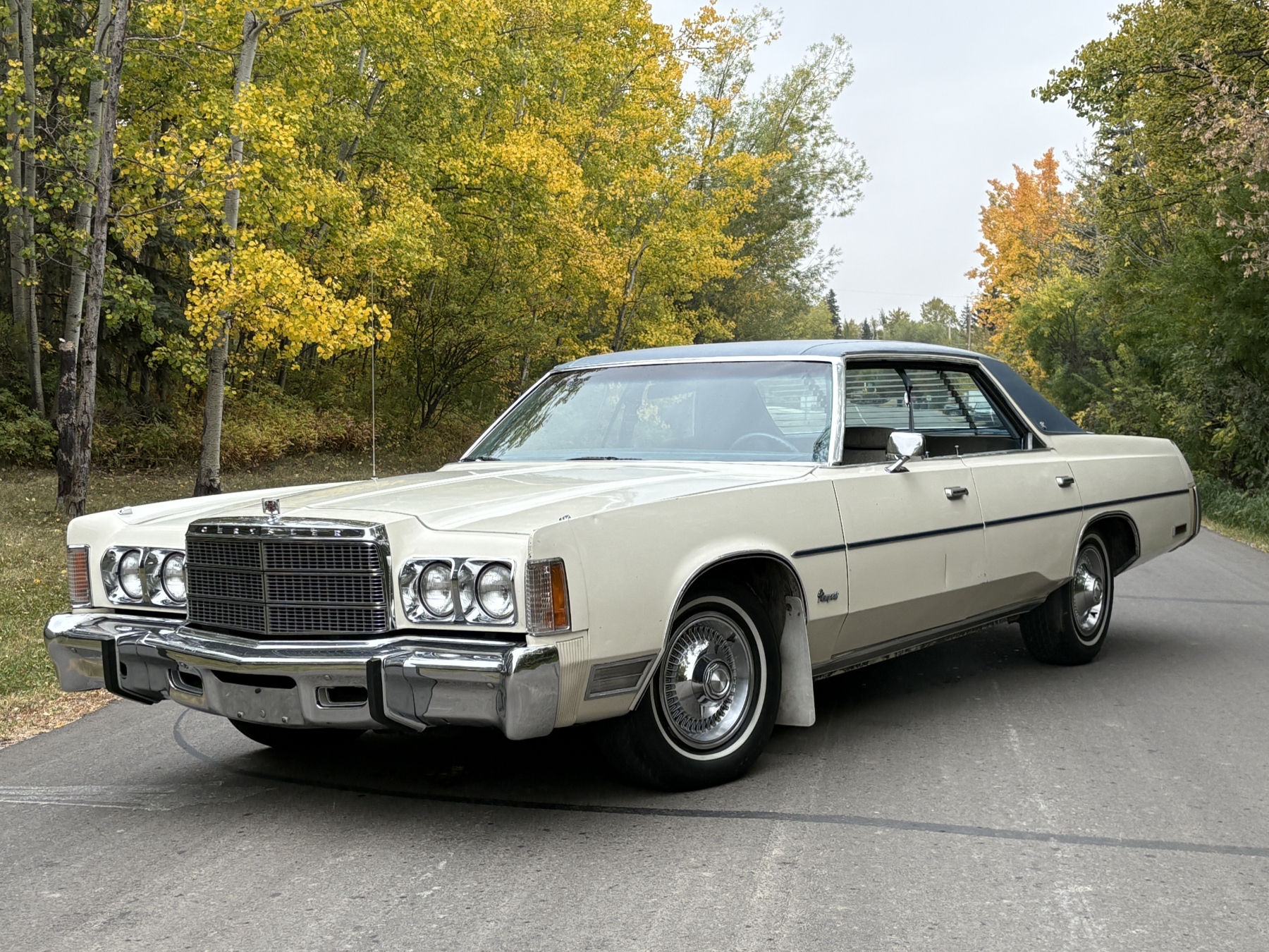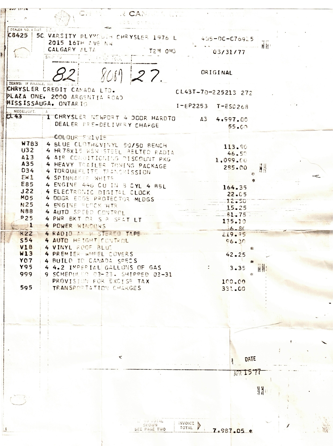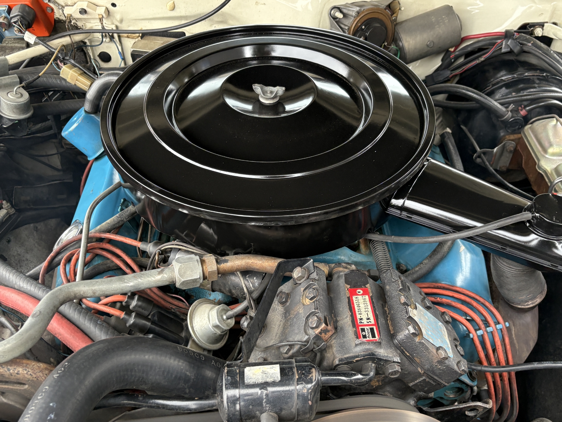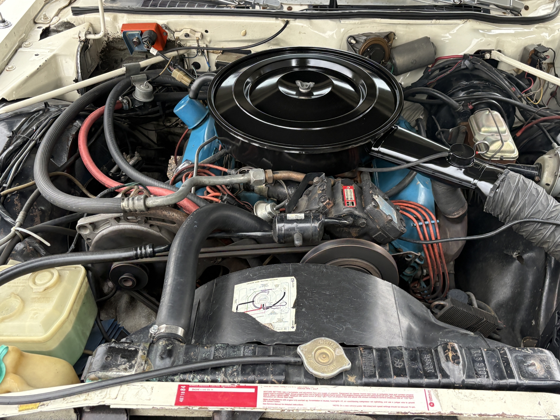 One previous owner. This vehicle has spent extended periods in indoor storage and has never been winter driven. Engine: 440 CID V8, Fuel: 4 BBL, Automatic transmission. Features include air conditioning, power windows, and a power driver’s seat. The odometer was changed from miles to kilometres at 40,177 miles (64,658 km, as pictured). Current odometer: 21,352 km. Total mileage: 86,111 kms. Alberta owned. Original window sticker from dealer with owners manual.