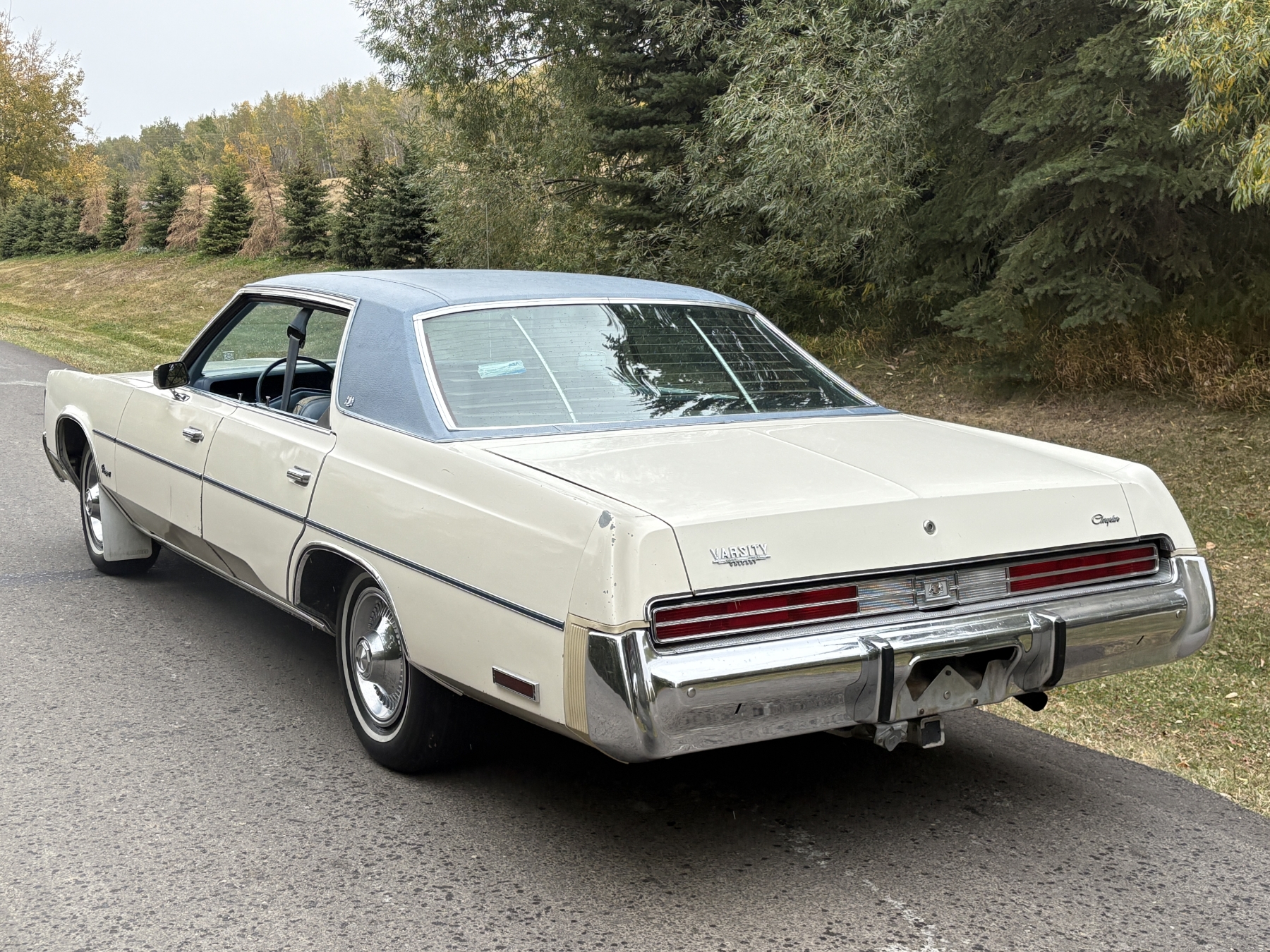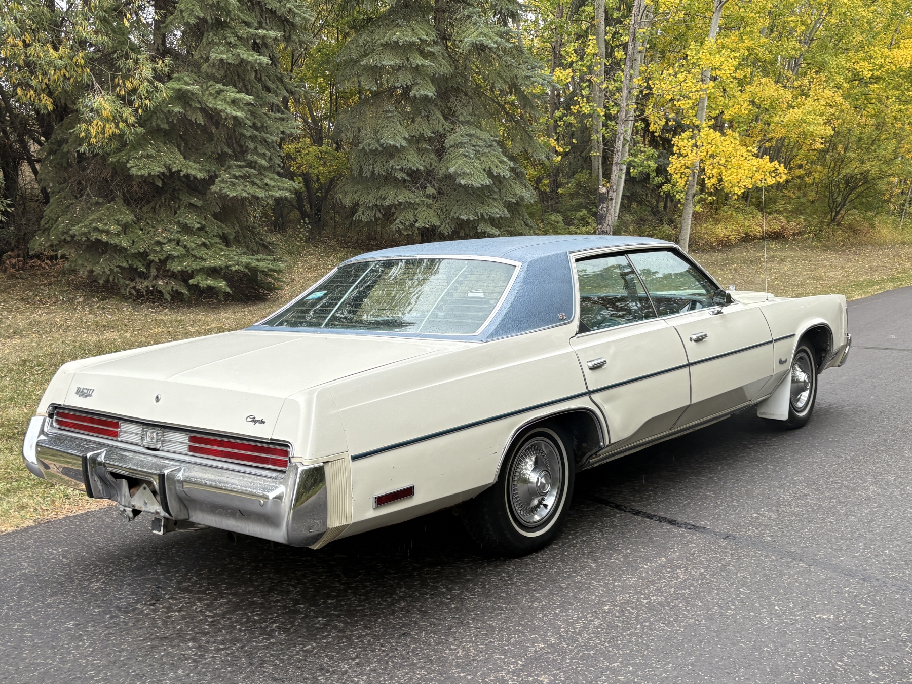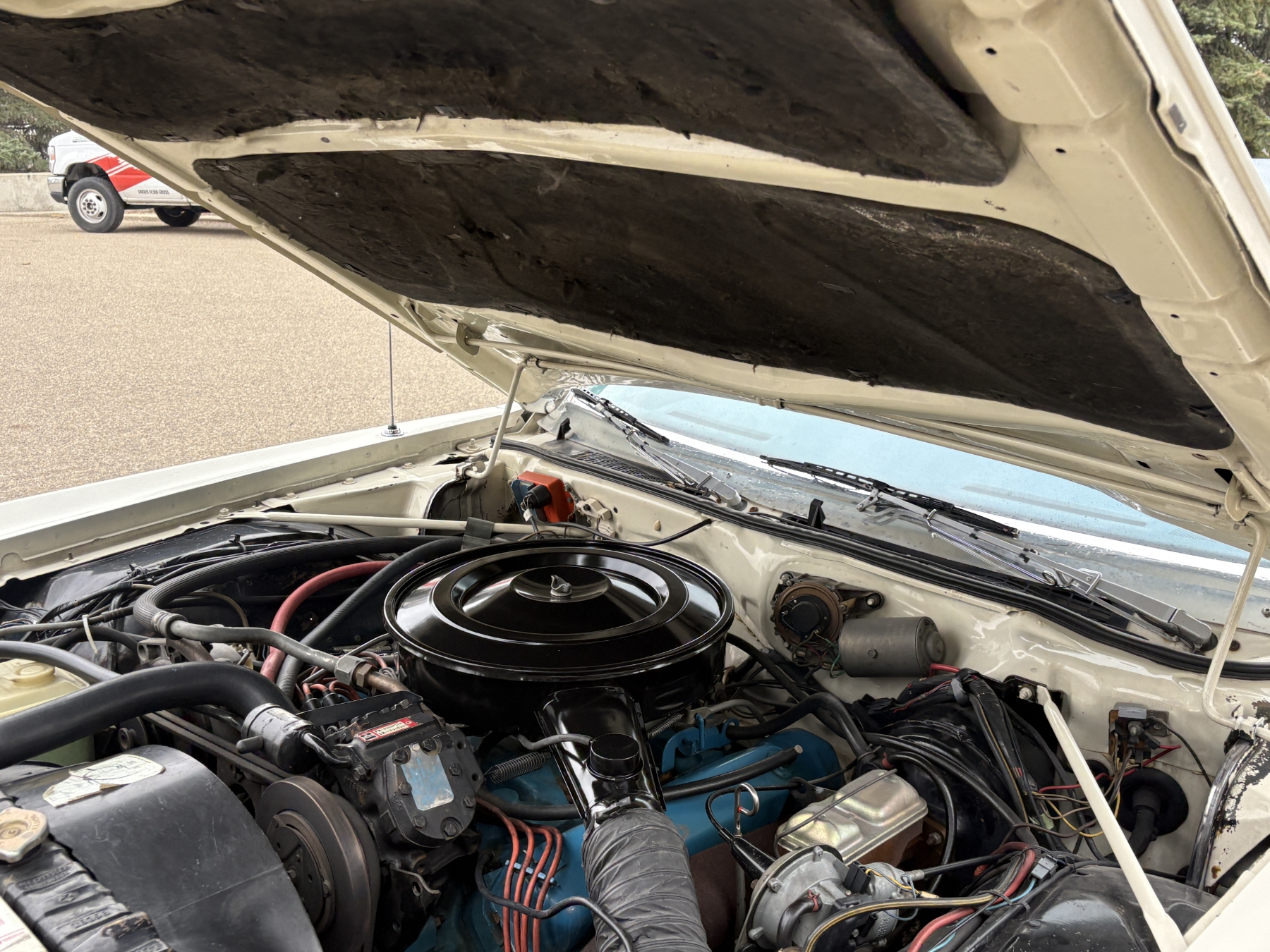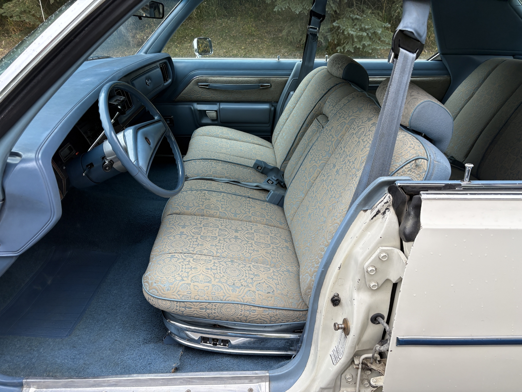 One previous owner. This vehicle has spent extended periods in indoor storage and has never been winter driven. Engine: 440 CID V8, Fuel: 4 BBL, Automatic transmission. Features include air conditioning, power windows, and a power driver’s seat. The odometer was changed from miles to kilometres at 40,177 miles (64,658 km, as pictured). Current odometer: 21,352 km. Total mileage: 86,111 kms. Alberta owned. Original window sticker from dealer with owners manual.
