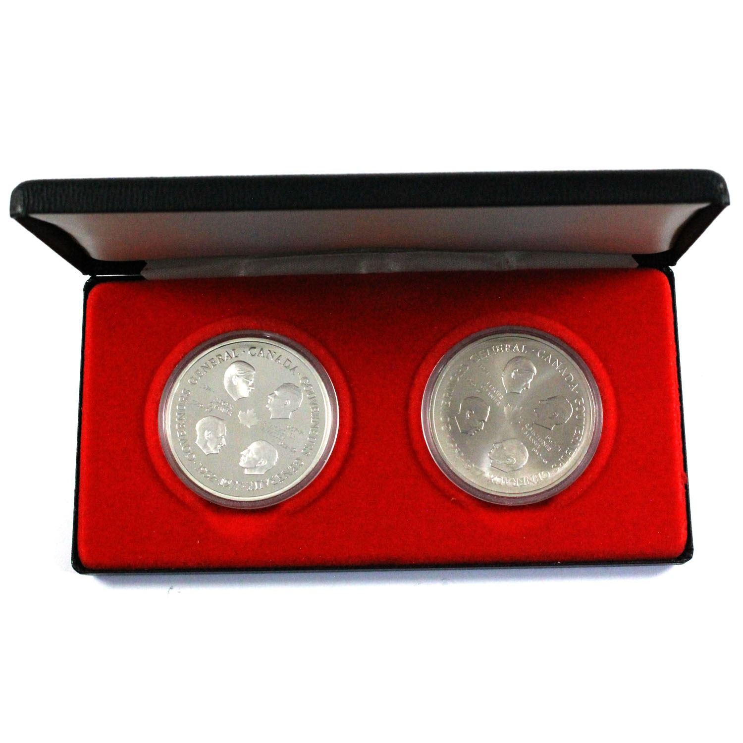 1977 Canada Four Governor Generals Sterling Silver & Cupronickel Medallion Set Issued by the RCM. All original packaging and COA. Capsules are scuffed and coins are toned.