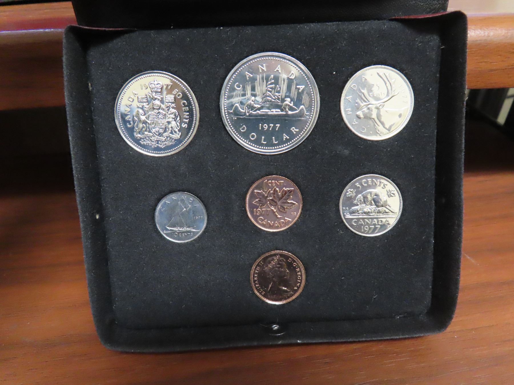 1977 Canadian Double Cent Custom Set. 7-coin set includes Nickel Dollar with Detached Jewel & Full Water Lines in front of the canoe. As issued by the Royal Canadian Mint.