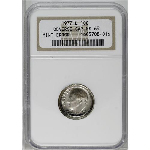 <B>1977-D<10C> Roosevelt Dime--Obverse Die Cap--MS69 NGC.</B></I> Not only is this an impressive die cap error, but it is also a virtually perfect example. The surfaces are highly lustrous with brilliant pale-gray color, accented by light gold on Roosevelt's hair. The fields are nearly prooflike. We do not see any surface marks of any kind, even with magnification.