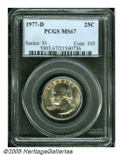 <B>1977-D<25C> MS67 PCGS.</B></I> A lustrous and meticulously struck Superb Gem, lovingly preserved and blessed with light apricot patina. Population: 23 in 67, 0 finer (3/05).<BR><I>From The Gary Kramer Collection of Washington Quarters.</B></I>