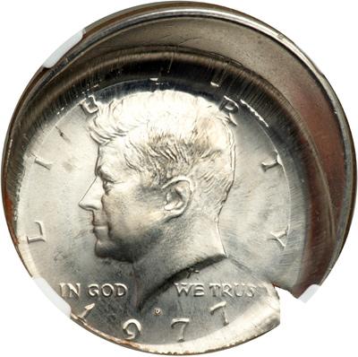 1977-D Cupped Off Center With Uniface Reverse. NGC graded Mint Error MS-67. A wonderful Mint Error, cupped pieces are always dramatic looking in a collection of error coins, especially when a large coin like this half dollar! Full date with mintmark.