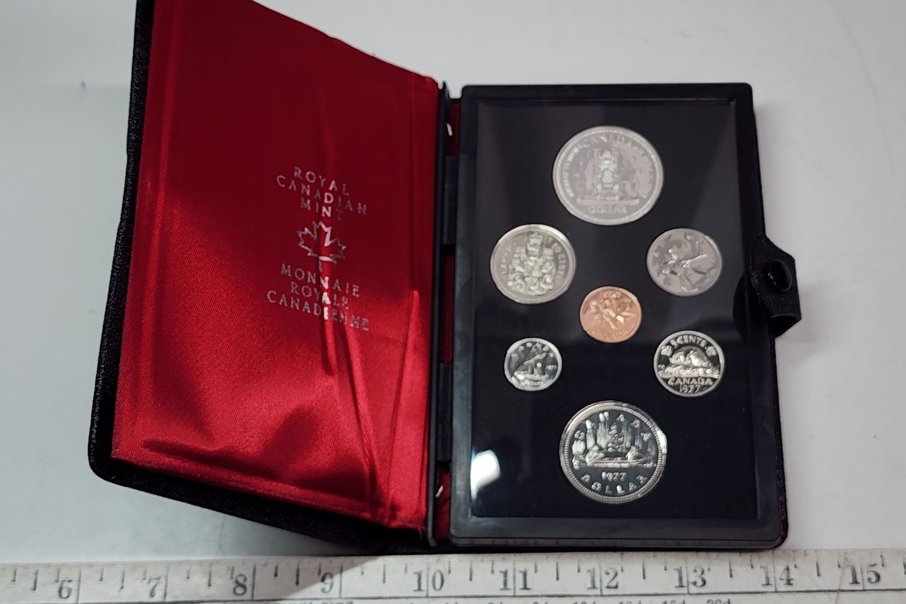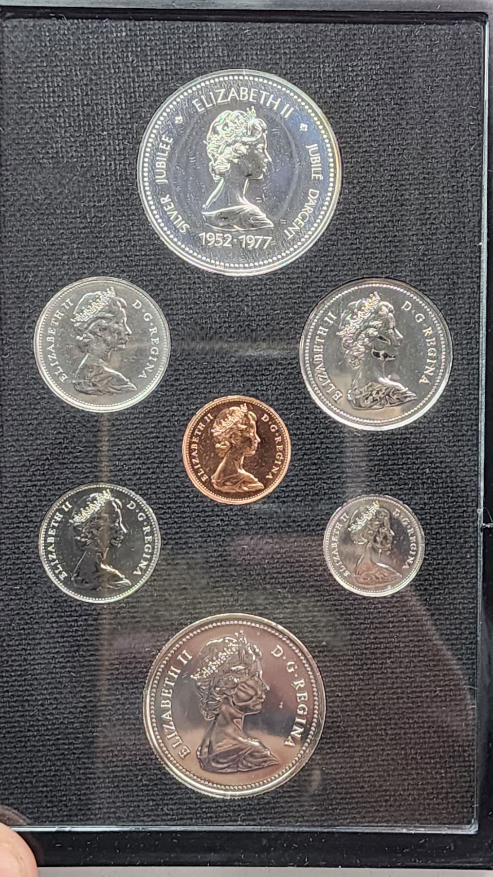 1977 Double Dollar Specimen Set. 7-coin set includes Silver Dollar that commemorates the 25th Anniversary of Queen Elizabeth on the throne. Housed in its original case of issue.