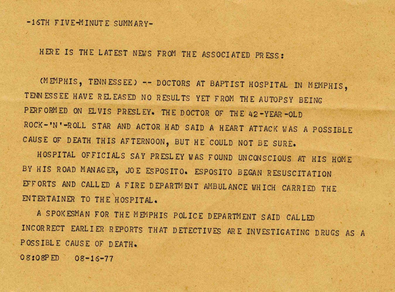 Elvis Death Teletype -- Memphis, Tennessee -- 16 August 1977 -- 7.5" x 5.75" -- Excellent