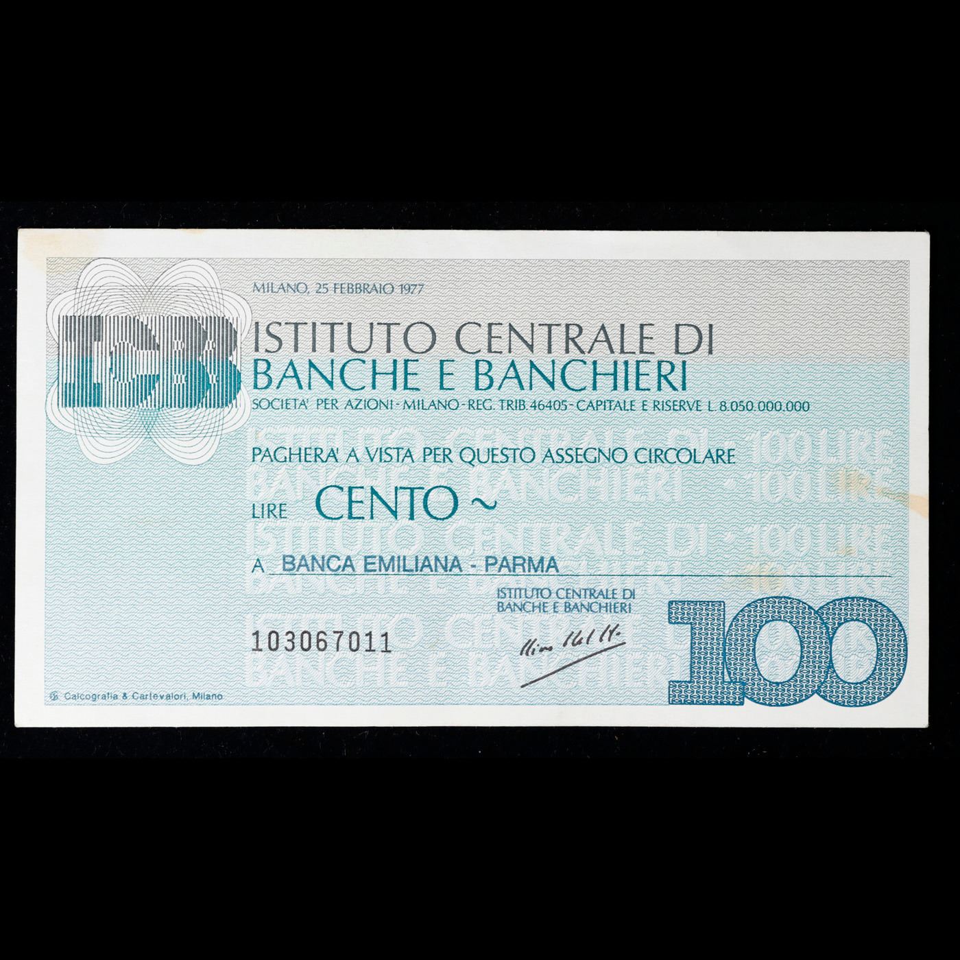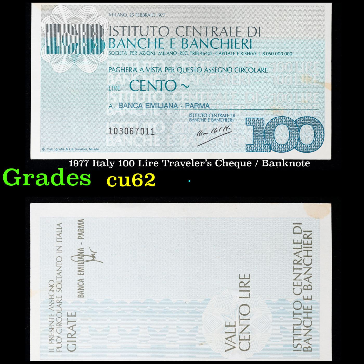 1977 Italy 100 Lire Traveler's Cheque / Banknote Grades Select CU.