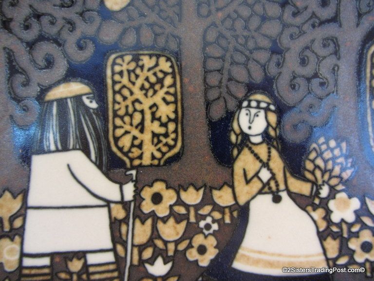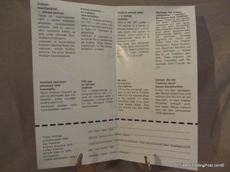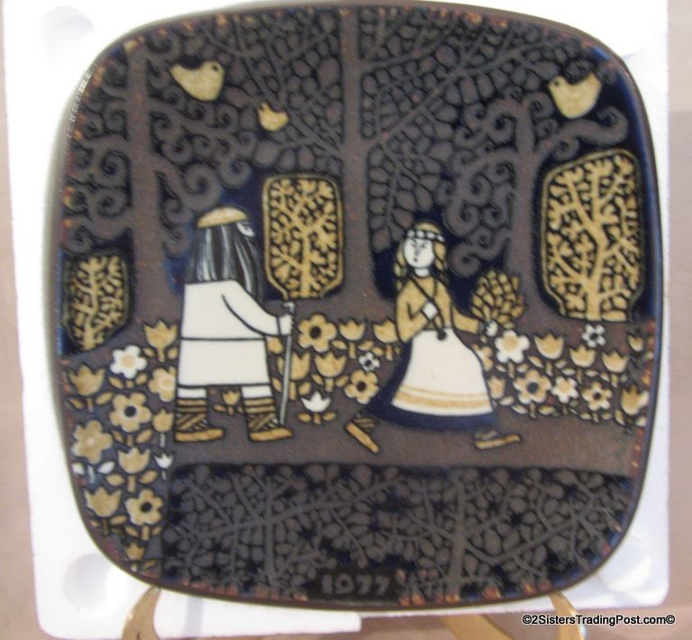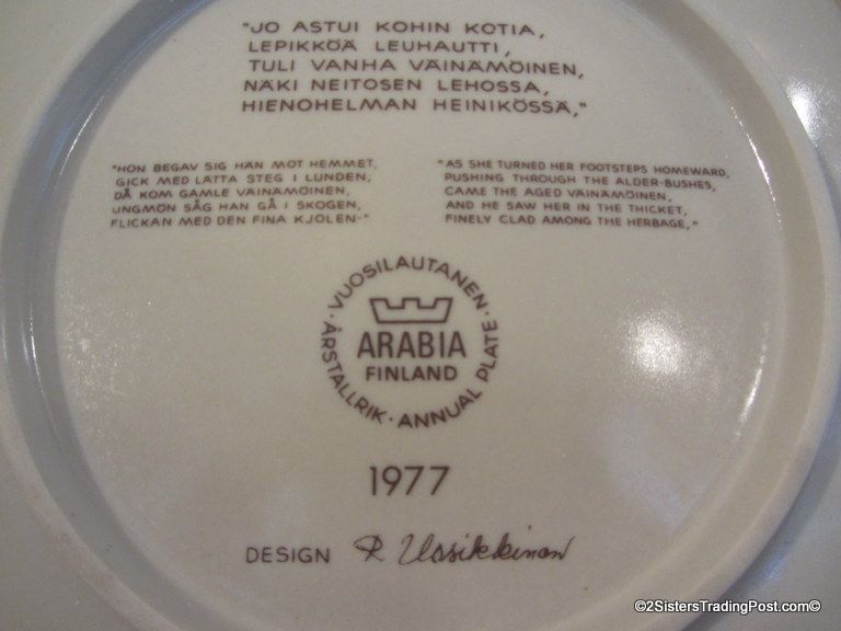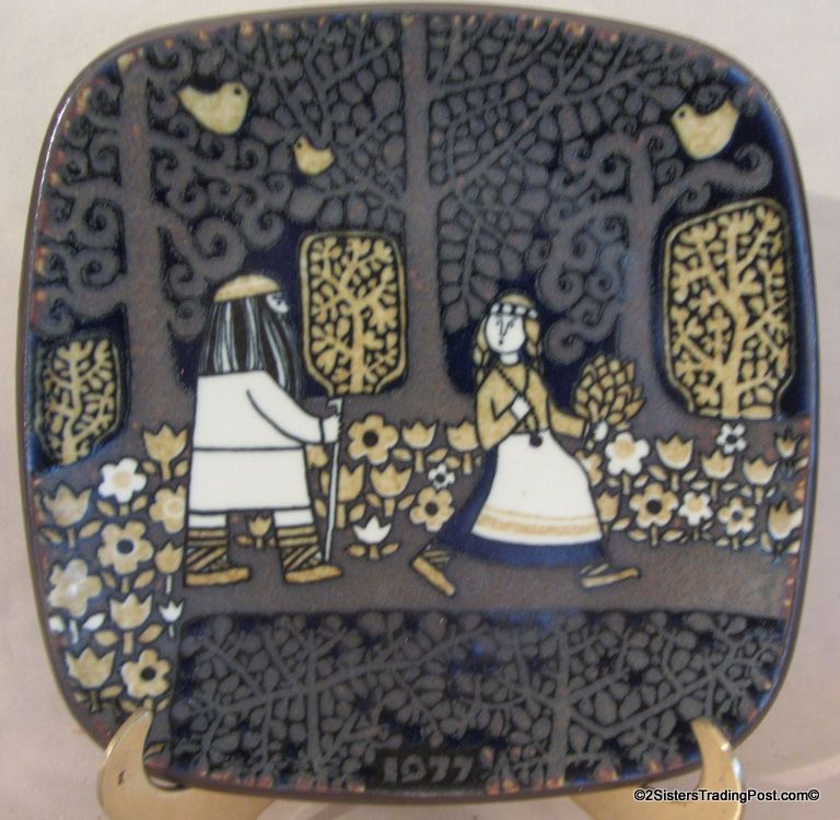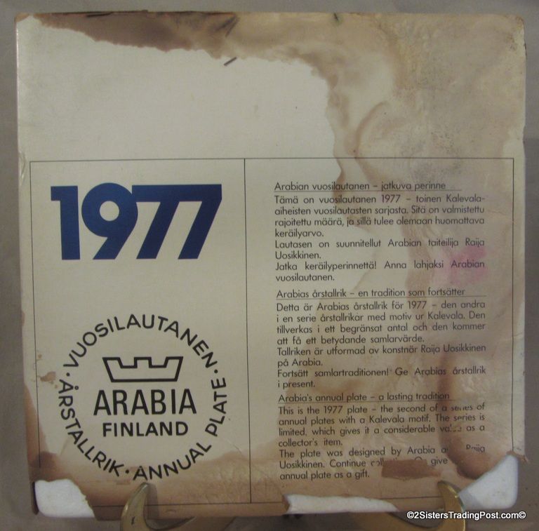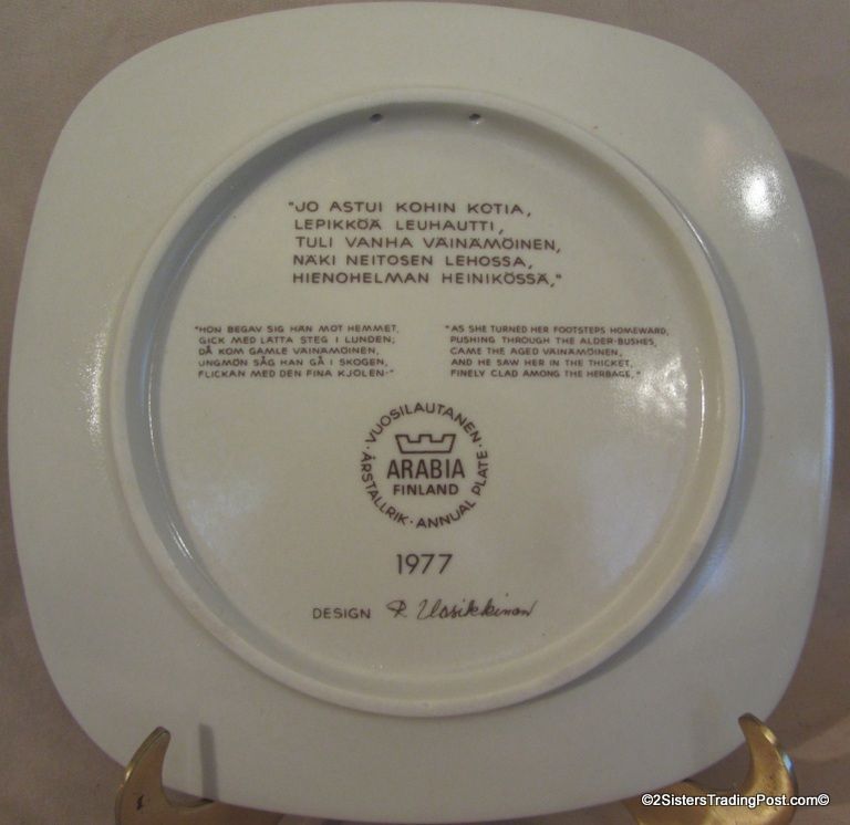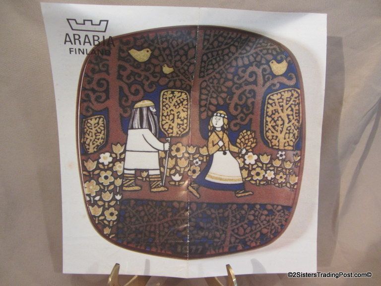 7 7/8" squared plate, dated 1977 Kalevala motif done on stoneware. This is the second plate in a series of 24 from Arabia Finland Kalevala Collection. Designed by artist Raija Uosiddinen. In the original descriptive sleeve and Styrofoam mailer with paperwork. (Please see images for details).