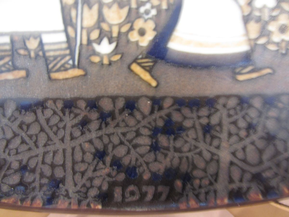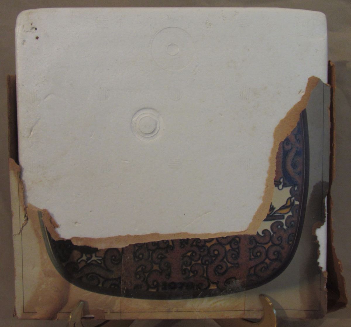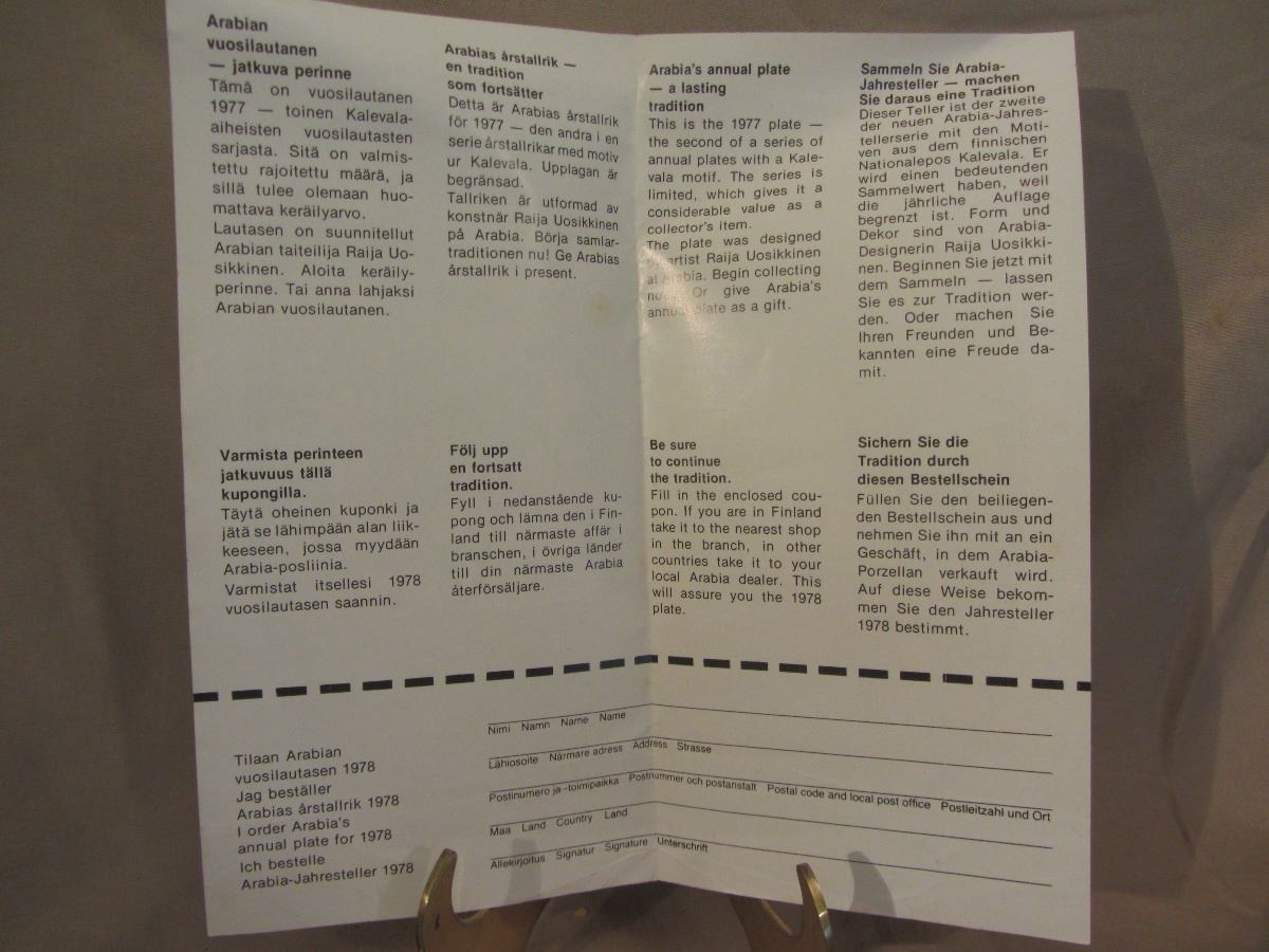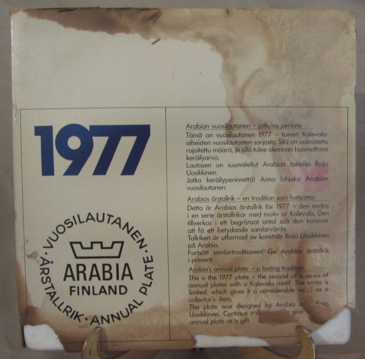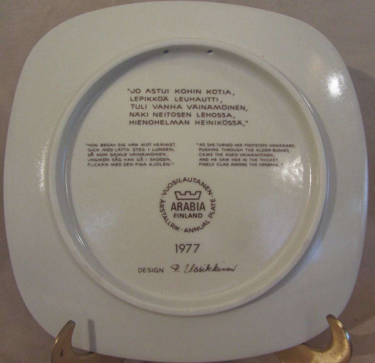 7 7/8" squared plate, dated 1977 Kalevala motif done on stoneware. This is the second plate in a series of 24 from Arabia Finland Kalevala Collection. Designed by artist Raija Uosiddinen. In the original descriptive sleeve and Styrofoam mailer with paperwork. (Please see images for details).