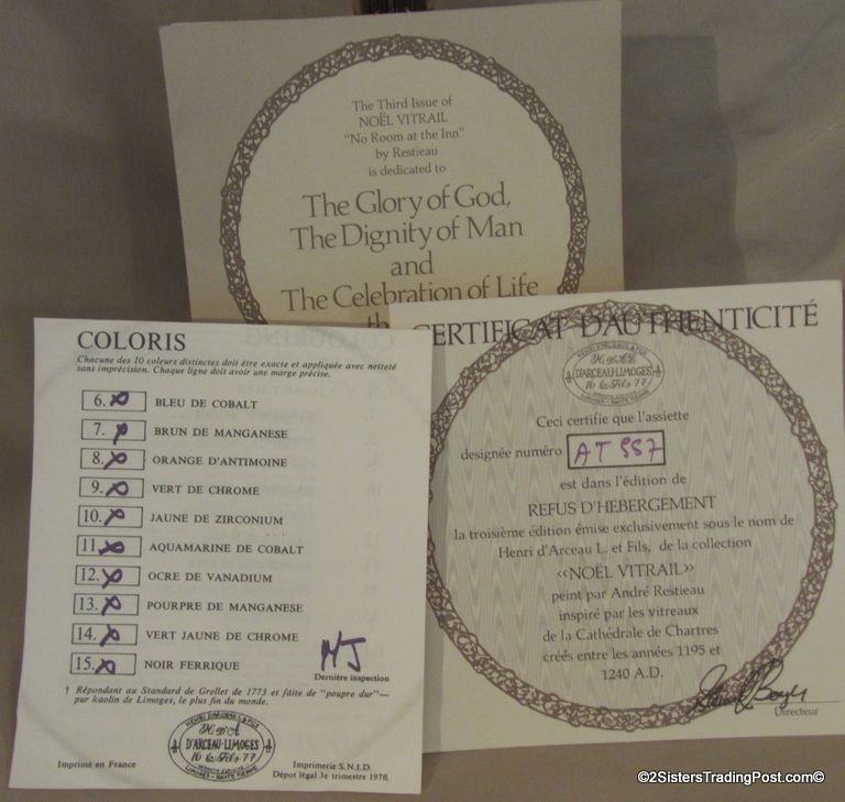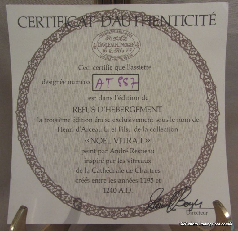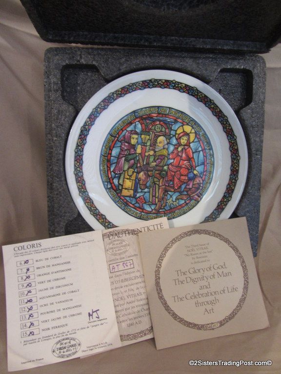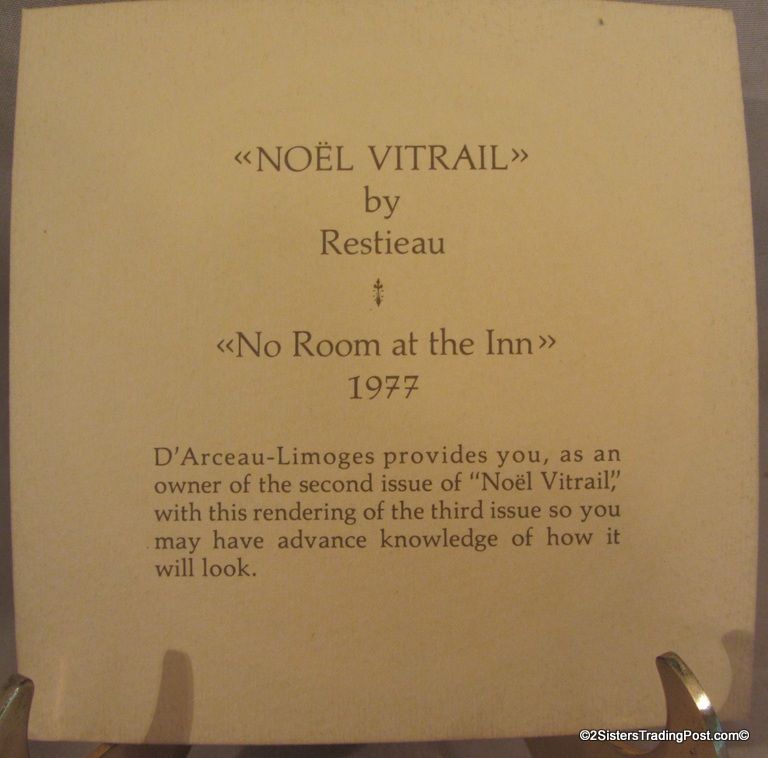 8 1/2" plate, 'No Room at the Inn' the third issue of Noel Vitrail *The Purification* by Restieau and is dedicated to "The Glory of God, The Dignity of Man and The Celebration of Life through Art". This is a Limoges Porcelain plate and is numbered AT 557 Comes in the original Styrofoam mailer, with paperwork and COA. NOTE: this plate has a chip in the rim at the bottom of plate as such price has been reduced. (Please see images for details)