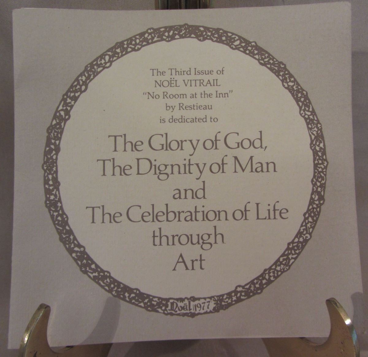 8 1/2" plate, 'No Room at the Inn' the third issue of Noel Vitrail *The Purification* by Restieau and is dedicated to "The Glory of God, The Dignity of Man and The Celebration of Life through Art". This is a Limoges Porcelain plate and is numbered AT 557 Comes in the original Styrofoam mailer, with paperwork and COA. NOTE: this plate has a chip in the rim at the bottom of plate as such price has been reduced. (Please see images for details)