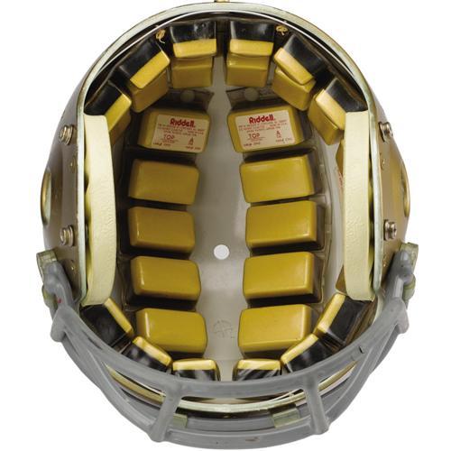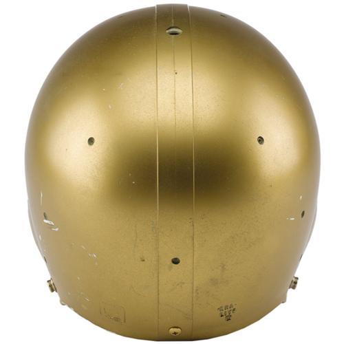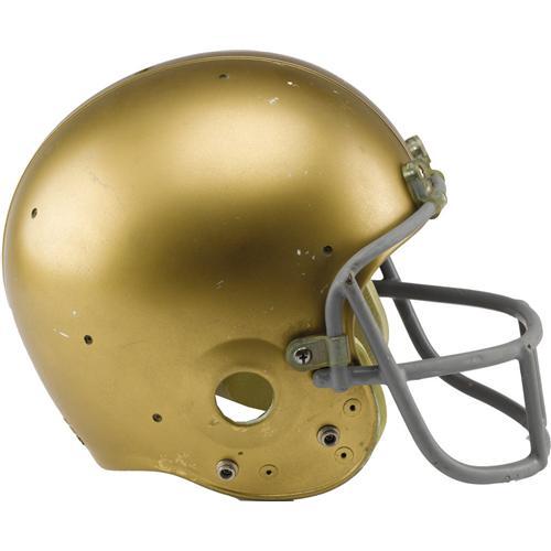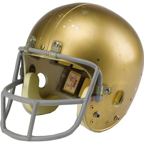 <B>1977 Notre Dame Game Worn Helmet.</B></I> Golden "Riddell PAC-3" helmet almost certainly shared the field with a young quarterback named Joe Montana, one of the many gridiron legends to hone his skills in South Bend. Exterior "Kra-Lite" shell exhibits nice wear to match interior padding system. Manufacturer's decal inside notes "Feb. 1978" warranty date to pin the helmet to this important era. Size "7 1/4" size decal is inside as well. Red dot full cage quarterback style face mask is affixed with original clips and housing. In short, a picture-perfect representation of a National Championship season gamer, and one of the toughest out there for Notre Dame collectors. <I>LOA from Lou Lampson.</B></I><BR><BR><b>Shipping:</b> Miscellaneous Collectibles, Larg (<a target="_blank" href="http://www.heritageauctions.com/common/shipping.php">view shipping information</a>)