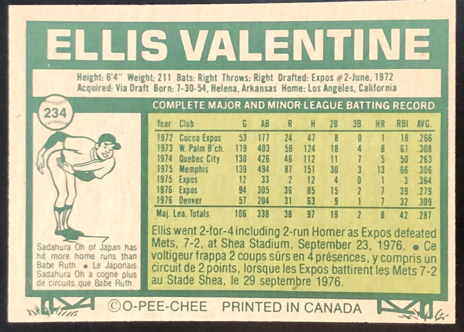 Card #234 MLB, baseball, OPC, vintage, rookie