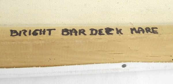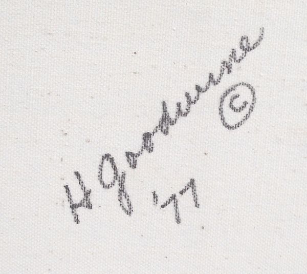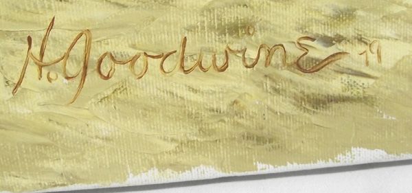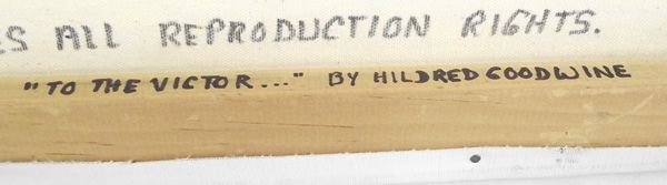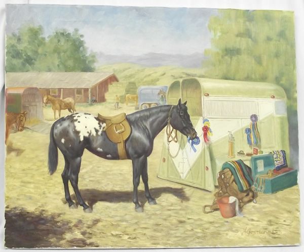 1977 Original Acrylic Painting Horse - Hildred Goodwine (1918-98). Measures 24'' x 30'' On stretched canvas, this painting of an appaloosa is called ''To the Victor . . .'' and is a painting done for the owner of the horse. It is featured in the book, ''The Happy Horses of H. Goodwine'' by Barbara Robinson. The charming paintings by artist Hildred Goodwine portray scenes rich with harmony and happiness. It is not at all unusual to find cats, dogs, chickens, horses--an entire bevy of barnyard and domestic animals--peacefully together in one scene. Although she loved all animals and paints and sculpted them with equal enthusiasm, Hildred's favorite subject was horses--horses of all sizes, shapes and breeds. Born in Michigan, her life on the farm there and experiences on ranches in Kansas and Arizona later in life gave her lasting memories that provided her with ample inspiration for her paintings. Hildred often chose animals from her own menagerie for models and in a very special way successfully captured the individual personality and beauty of each subject. (Source: Information provided by Gary Lasko as posted on Ask Art). Many of Goodwine's paintings can be found on ''Leaning Tree'' greeting cards and the covers of ''Western Horseman'' magazines.