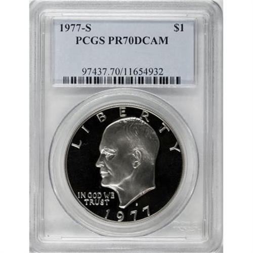 <B>1977-S $1 PR70 Deep Cameo PCGS.</B></I> An amazing 1977-S Eisenhower dollar, one of just 12 coins that PCGS has certified in the ultimate PR70 Deep Cameo grade. It just doesn't get any better than this. Both sides are light nickel-gray, as bright and fresh as the day this coin was struck.<BR><BR><b>Shipping:</b> Coins & Currency (<a target="_blank" href="http://www.heritageauctions.com/common/shipping.php">view shipping information</a>)