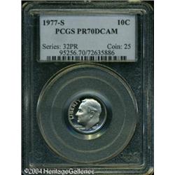 1977-S 10C PR70 Deep Cameo PCGS. This pristine pro <B>1977-S 10C PR70 Deep Cameo PCGS.</B></I> This pristine proof Roosevelt Dime features imposing ice-white devices and seamless mirrored fields. A prize for the Registry Set collector. Population: 52 in 70 (11/04). <BR><BR><B>Important notice:</B> Heritage usually auctions material at the rate of 200-250 lots per hour. On some occasions eBay Live bid software or the Internet may not be able to keep up with the pace of the auction. We recommend placing a realistic absentee bid now as insurance to avoid disappointment. Occasionally the auctioneer may eliminate or reject an eBay Live bid, and the auctioneer may also reopen a lot after the close of the eBay live bidding (usually because we missed an audience bid), and may reject your bid even if it shows you as the winning bidder. By bidding via eBay Live, you agree that Heritage may award the lot to another bidder at its sole discretion under the circumstances described above or any other reasonable circumstances. Since eBay bids are not shown to us until we open the lot on the floor, we treat those bids just like floor bids. In most cases the floor responds before the eBay bid is presented to us, due to Internet lag time, so for consistency we have made it a policy that floor bids are always considered first over tie eBay live bids. Also please note that all Heritage lots purchased through eBay Live carry a 20% Buyer's Premium. Please make sure you read the Terms and Conditions before you bid. This lot is being auctioned in conjunction with a live floor auction by Heritage Galleries & Auctioneers. All final auction and invoice information will be supplied by Heritage Galleries & Auctioneers, and all other information should be considered preliminary. Lot:5857