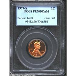 1977-S 1C PR70 Deep Cameo PCGS. A razor-sharp and essentially carbonless specimen with a blush of ro