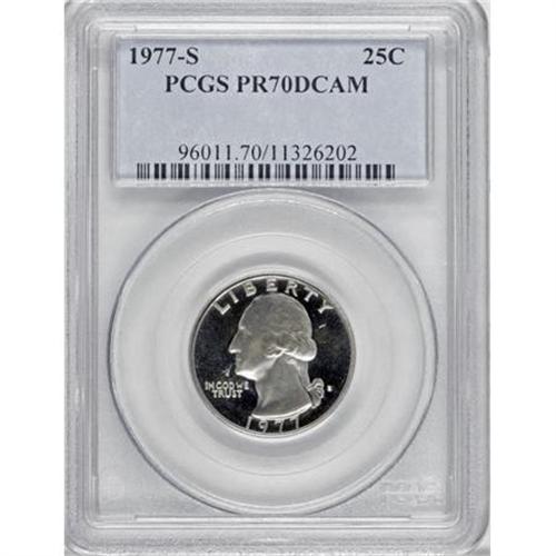 <B>1977-S 25C PR70 Deep Cameo PCGS.</B></I> PCGS Population (48/0). NGC Census: (3/0). Numismedia Wsl. Price for NGC/PCGS coin in PR70: $350. (#96011)<BR><BR><b>Shipping:</b> Coins & Currency (<a target="_blank" href="http://www.heritageauctions.com/common/shipping.php">view shipping information</a>)