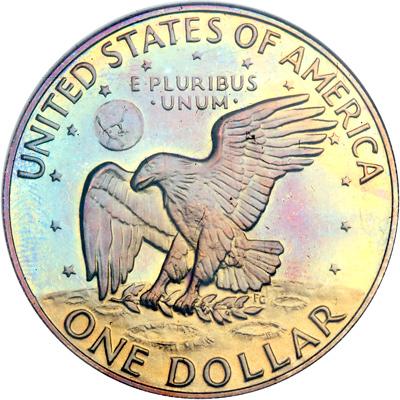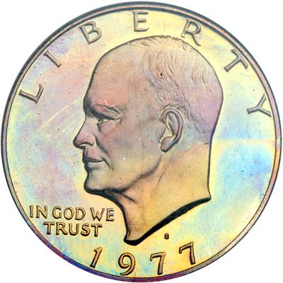 1977-S Eisenhower Dollar. NGC graded Proof 68 Cameo. Lovely shades of lilac, blue, and golden toning.