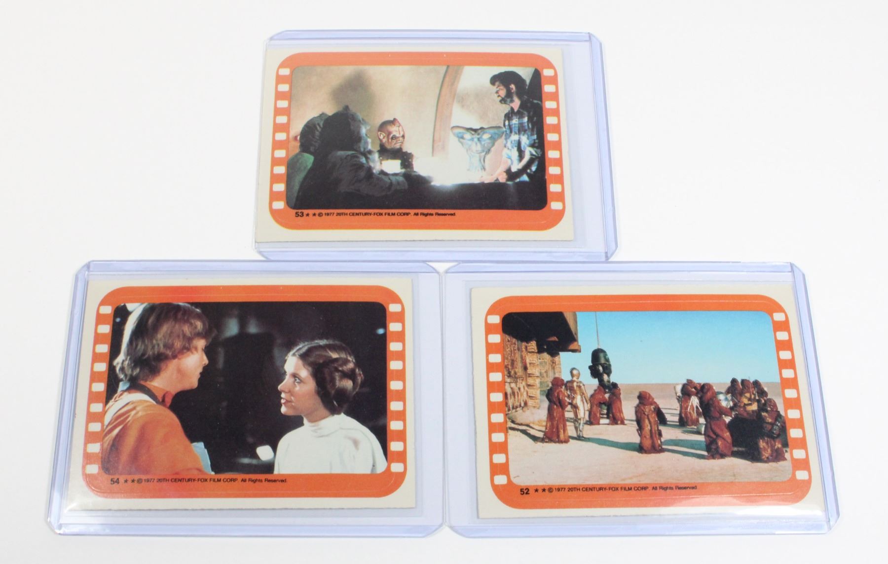 1977 STAR WARS TOPPS STICKER CARD #53 CANTINA, AND 1977 STAR WARS TOPPS STICKER CARD #54 LEIA WISHES LUKE GOOD LUCK. ALL IN PROTECTIVE SLEEVE. READY TO GRADE!