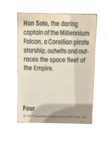 1977 Twentieth Century Fox Film Corp Star Wars Han Solo (Harrison Ford) Wonder Bread promotion rookie trading card. Excellent condition. Rare. #4 in the series.