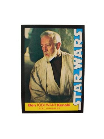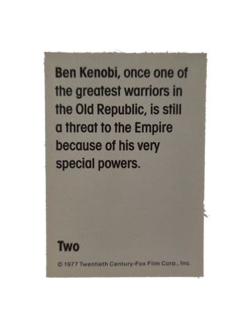 1977 Star Wars Wonder Bread, Twentieth Century Fox Trading Card #2 Ben Kenobi. This card originally came in a specially marked bag of Wonder Bread. One loaf, one card. The Wonder Bread set of 16 trading cards developed to help sell Wonder Bread was primarily a North American release. It is a largely character based set covering main characters on both sides of the Rebellion including Luke Skywalker, Princess Leia, Han Solo, Darth Vader and Grand Moff Tarkin. A handful of spaceships are mixed in at the end of the checklist for this set. (2.5" x 3.5")