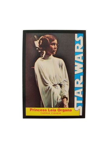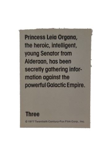 1977 Star Wars Wonder Bread, Twentieth Century Fox Trading Card #3 Princess Leia Organa. This card originally came in a specially marked bag of Wonder Bread. One loaf, one card. The Wonder Bread set of 16 trading cards developed to help sell Wonder Bread was primarily a North American release. It is a largely character based set covering main characters on both sides of the Rebellion including Luke Skywalker, Princess Leia, Han Solo, Darth Vader and Grand Moff Tarkin. A handful of spaceships are mixed in at the end of the checklist for this set. (2.5" x 3.5")
