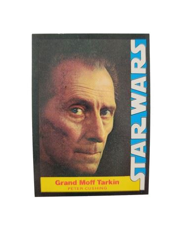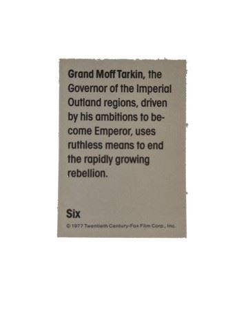 1977 Star Wars Wonder Bread, Twentieth Century Fox Trading Card #6 Grand Moff Tarkin. This card originally came in a specially marked bag of Wonder Bread. One loaf, one card. The Wonder Bread set of 16 trading cards developed to help sell Wonder Bread was primarily a North American release. It is a largely character based set covering main characters on both sides of the Rebellion including Luke Skywalker, Princess Leia, Han Solo, Darth Vader and Grand Moff Tarkin. A handful of spaceships are mixed in at the end of the checklist for this set. (2.5" x 3.5")