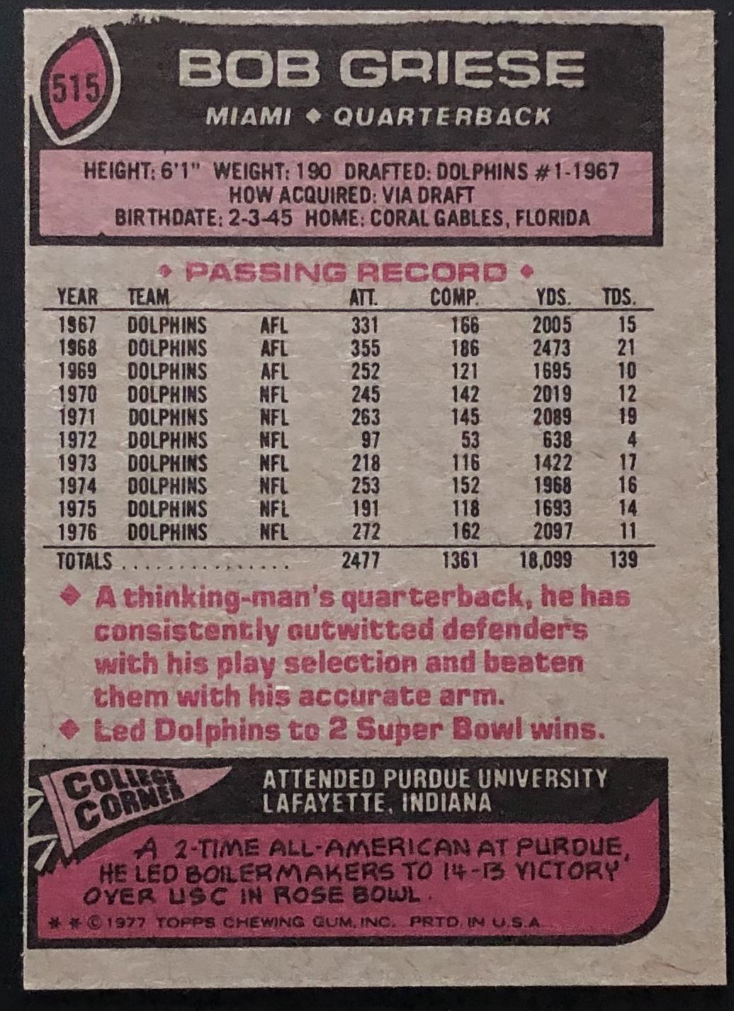 Card #515 NFL, football, vintage, hall of fame