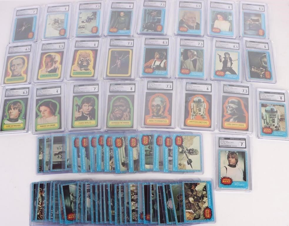 1977 Topps complete Star Wars series #1 with slabbed and graded cards as well as all eleven stickers. Slabbed cards include: Luke Skywalker #1 (7.0), C3PO & R2D2 #2 (6.0), The Littlle Droid #3 (8.0), Space Pirate Han Solo #4 (8.5), Princess Leia Organa #5 (8.0), Ben OBi-Wan #6 (5.5), Darth Vader #7 (7.5), Moff Tarkin #8 (6.0), Rebels #9 (7.5), Sandpeople #20 (9.0), Battle #53 (7.0), Harrison Ford #58 (8.5), Ben Kenobi #59 (7.5), May The Force Be with You #63 (8.5), All eleven stickers are graded by CGC, grades range from 8-4. All cards are included #1-66 + eleven stickers.