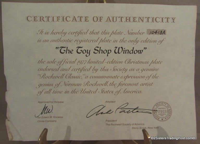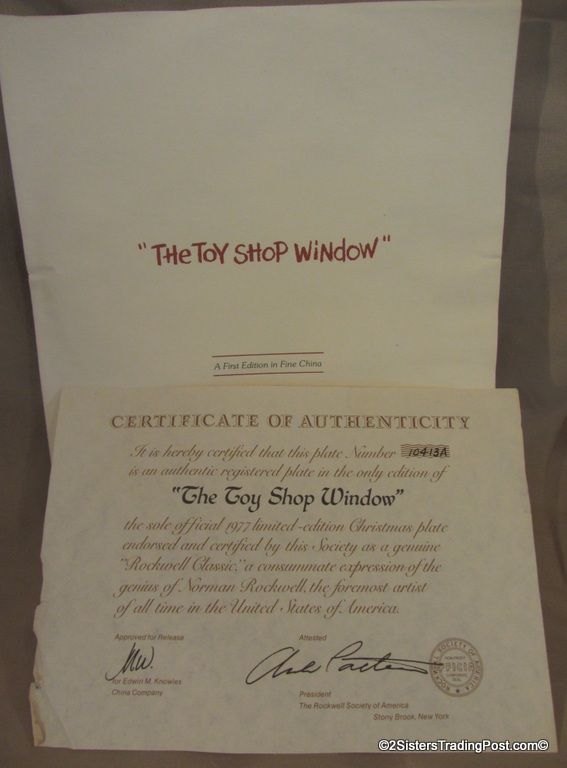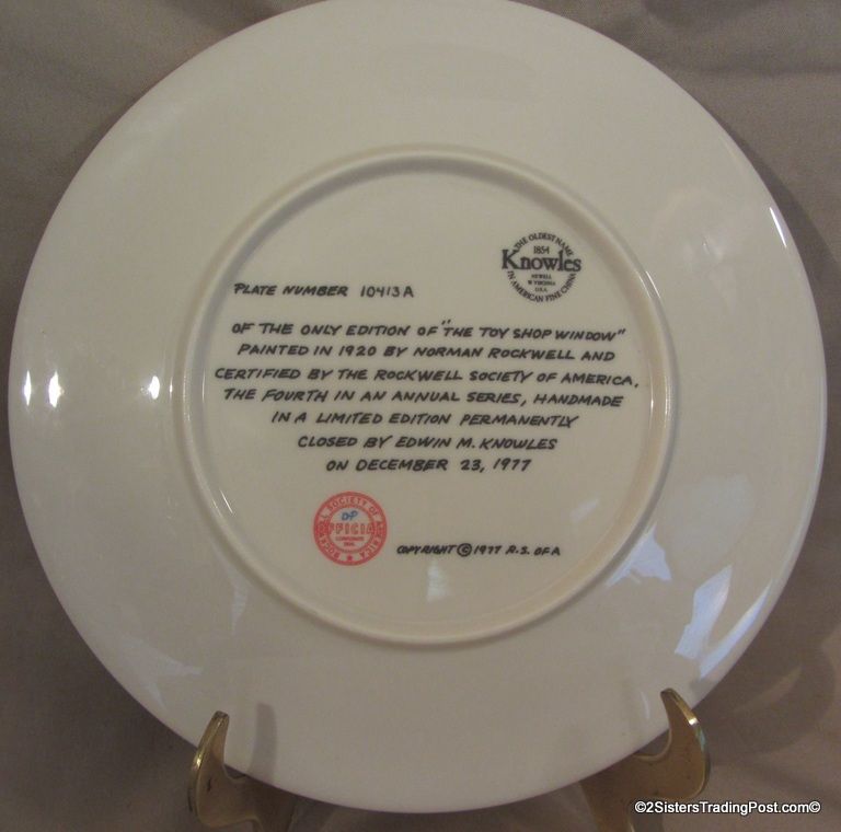 8 1/4" plate, dated 1977 'The Toy Shop Window' this plate is a limited-edition Christmas plate is endorsed and certified as a genuine 'Rockwell Classic'. The plate number is 10413A, Bradex and made available by Edwin M. Knowles Co. It comes in the original Styrofoam mailer, with paperwork and COA. (Please see images for details)