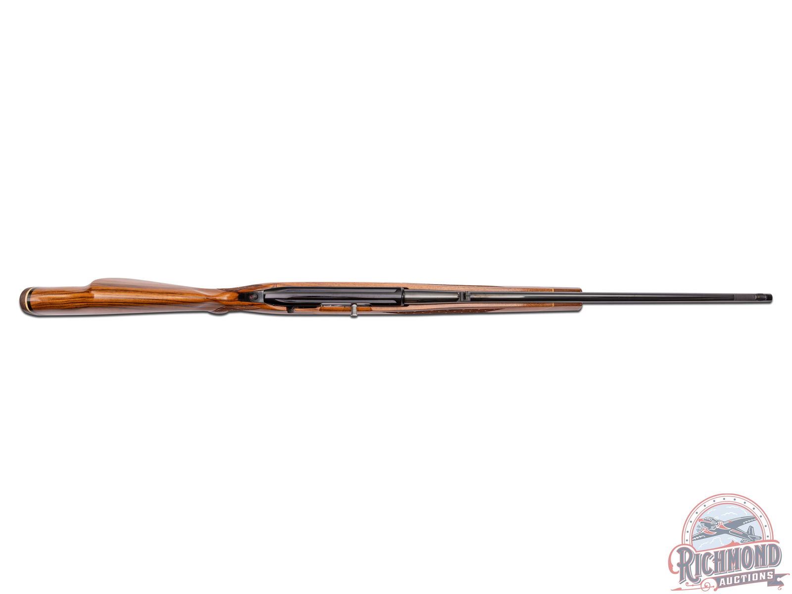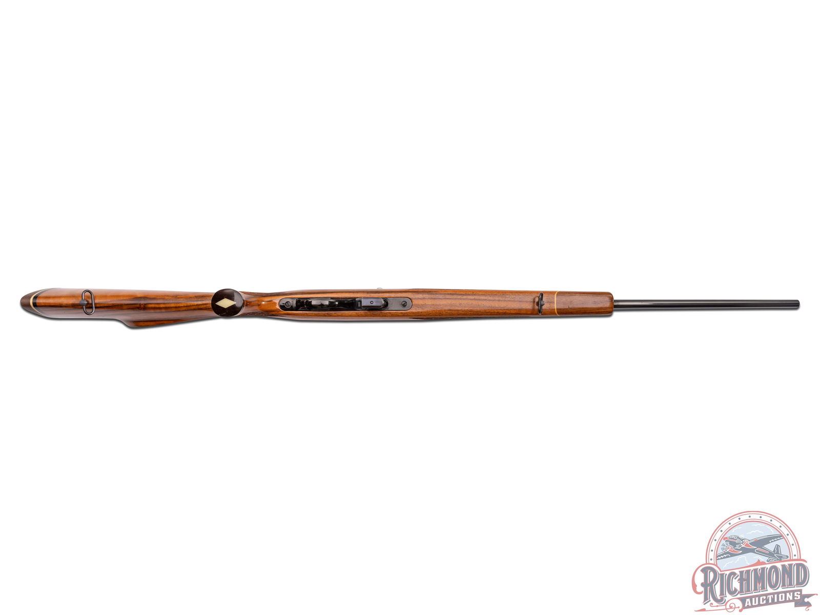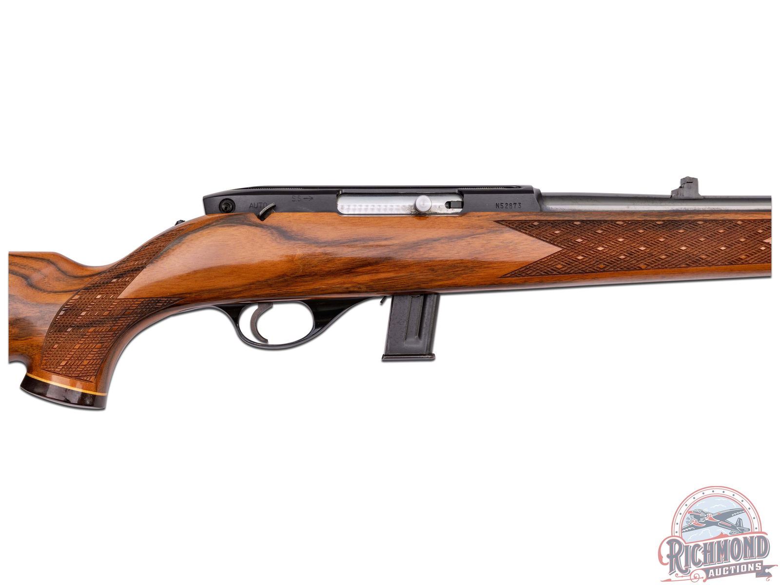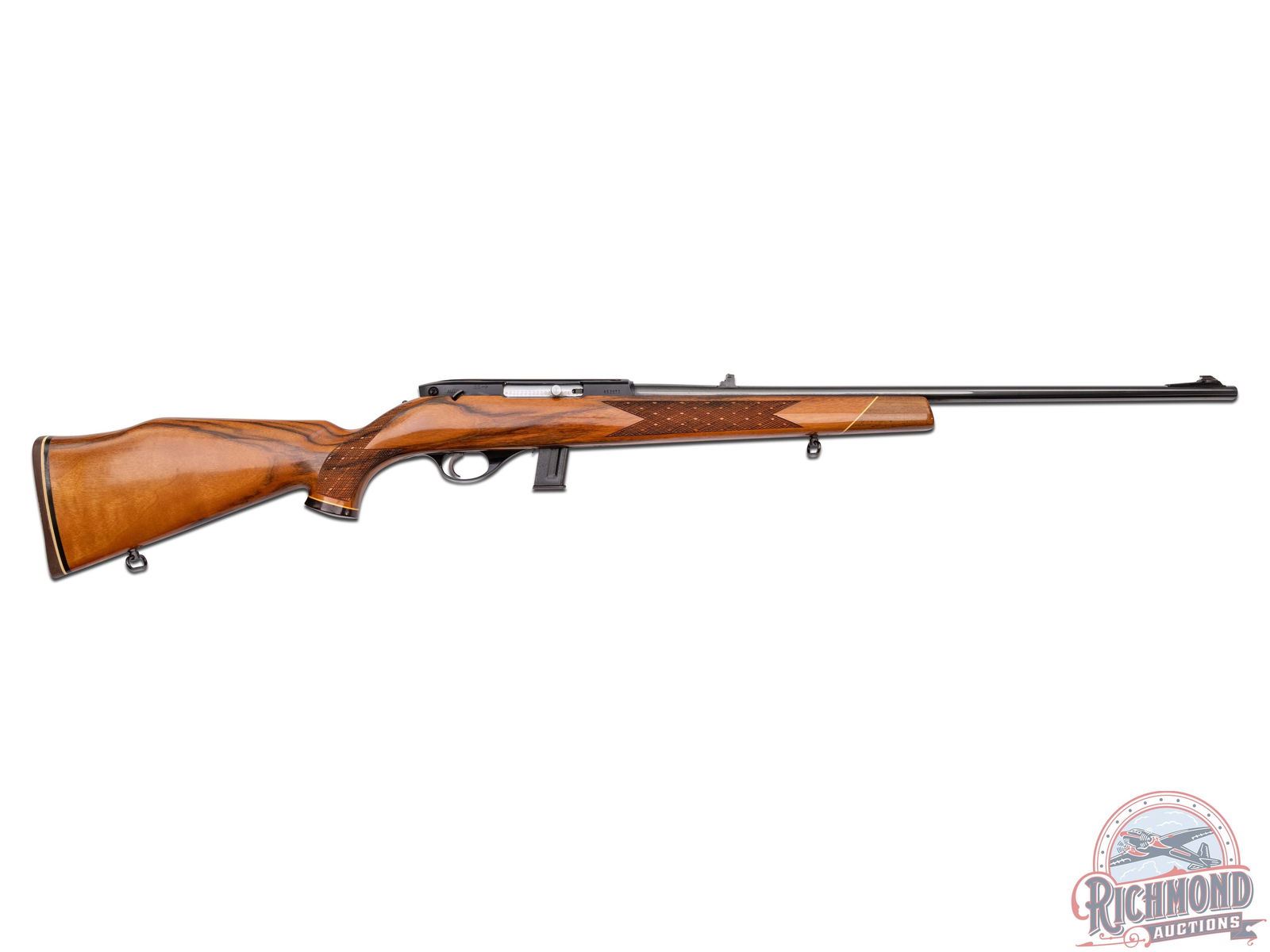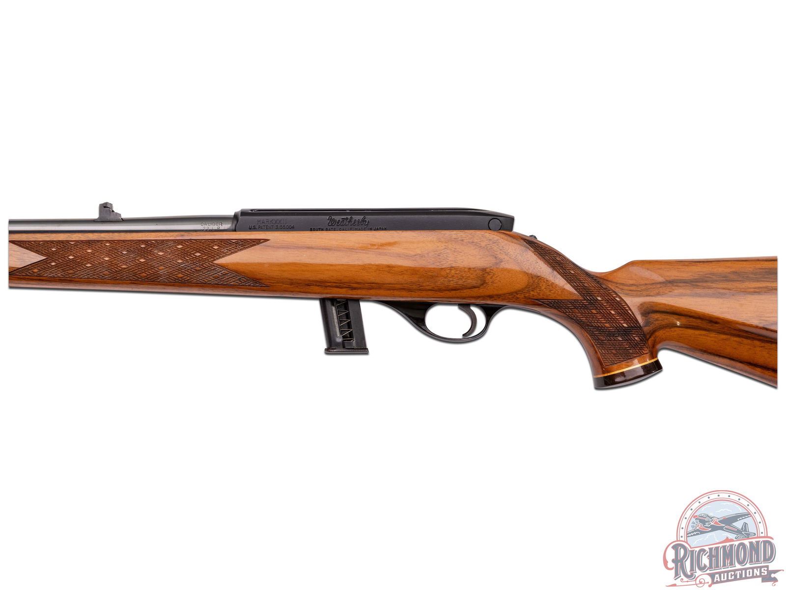 Manufactured circa 1977 by Weatherby in Japan. Features a 24" blued tapered barrel with 3-range leaf flip-up rear notch and front blade and ramped blade with brass bead sight. Detachable 10-round magazine feds a semi-automatic action. Blued receiver with dovetail groove. Tang mounted manual thumb safety and blued steel trigger guard. High gloss oak wood stock with skip-line checkering on pistol grip and foregrip. Right side cheekpiece. White lined forearm tip and Rosewood pistol grip cap with white diamond inlay. Black and white lined factory brown recoil pad and equipped with sling swivels. LOP: 13-1/2". CALIBER: 22 LR. S/N: N52873. FFL STATUS: Modern.