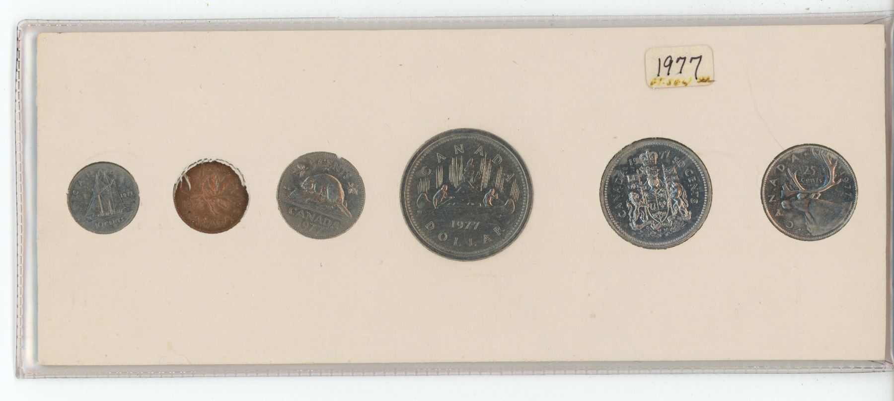 1977 Year Set. Nickel Dollar is the Scarce Detached Jewel with Short Water Lines in front of canoe. Uncirculated.