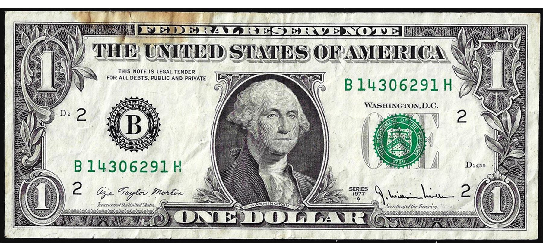 One 1977A $1 Federal Reserve Note New York Ink Smear ERROR.