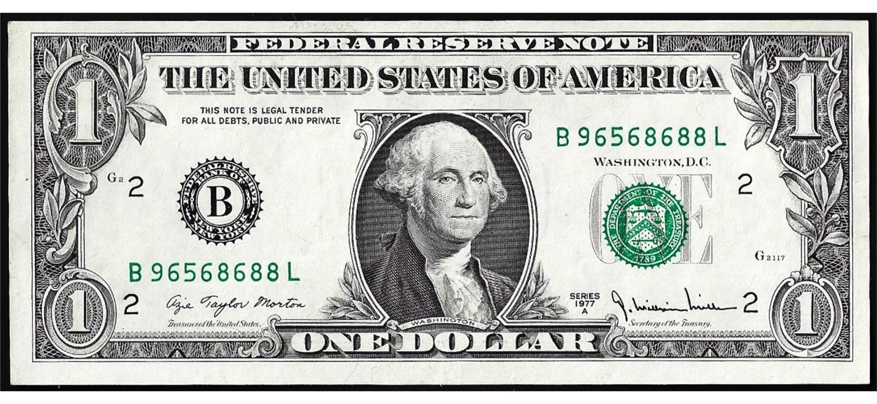 One 1977A $1 Federal Reserve Note New York Insufficient Inking Error.