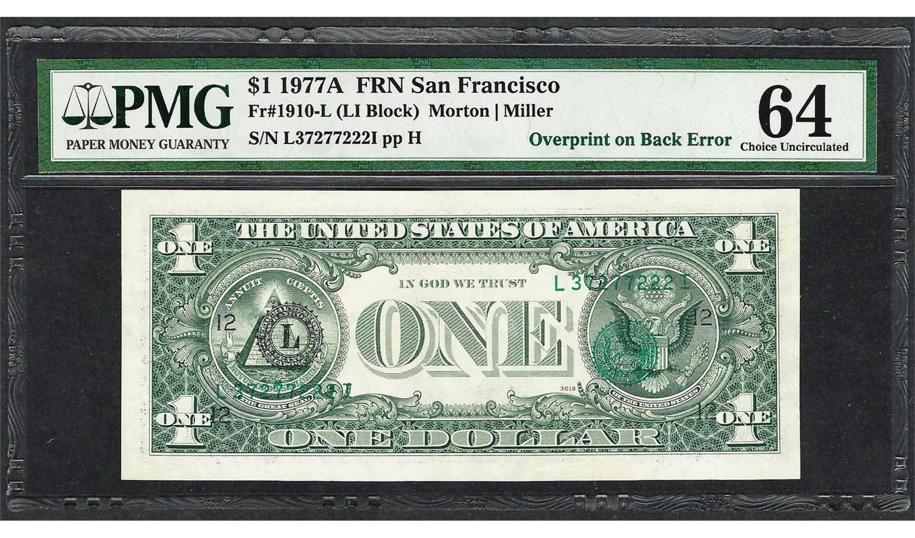 1977A $1 Federal Reserve Note San Francisco Overprint on Back Error PMG 64