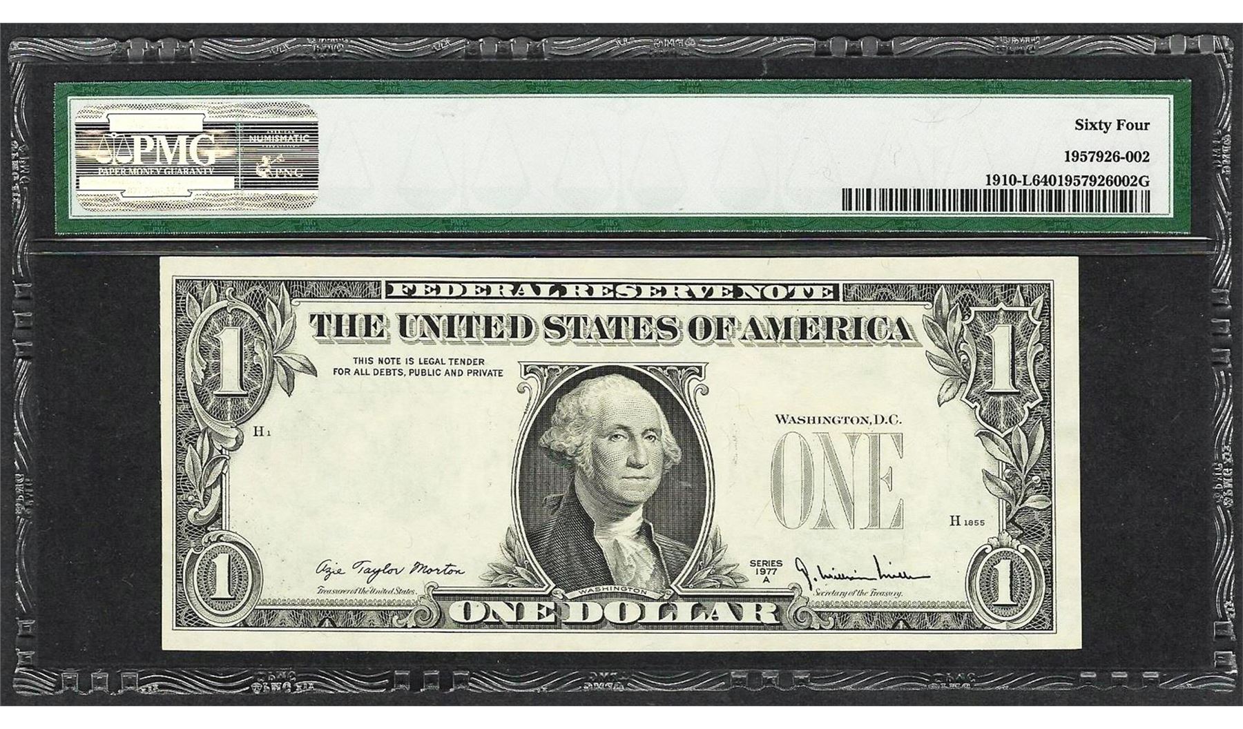 One 1977A $1 Federal Reserve Note San Francisco Overprint on Back Error PMG 64. PMG Certified.