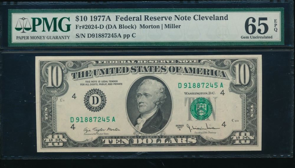 One 1977A $10 Cleveland FRN PMG 65EPQ.