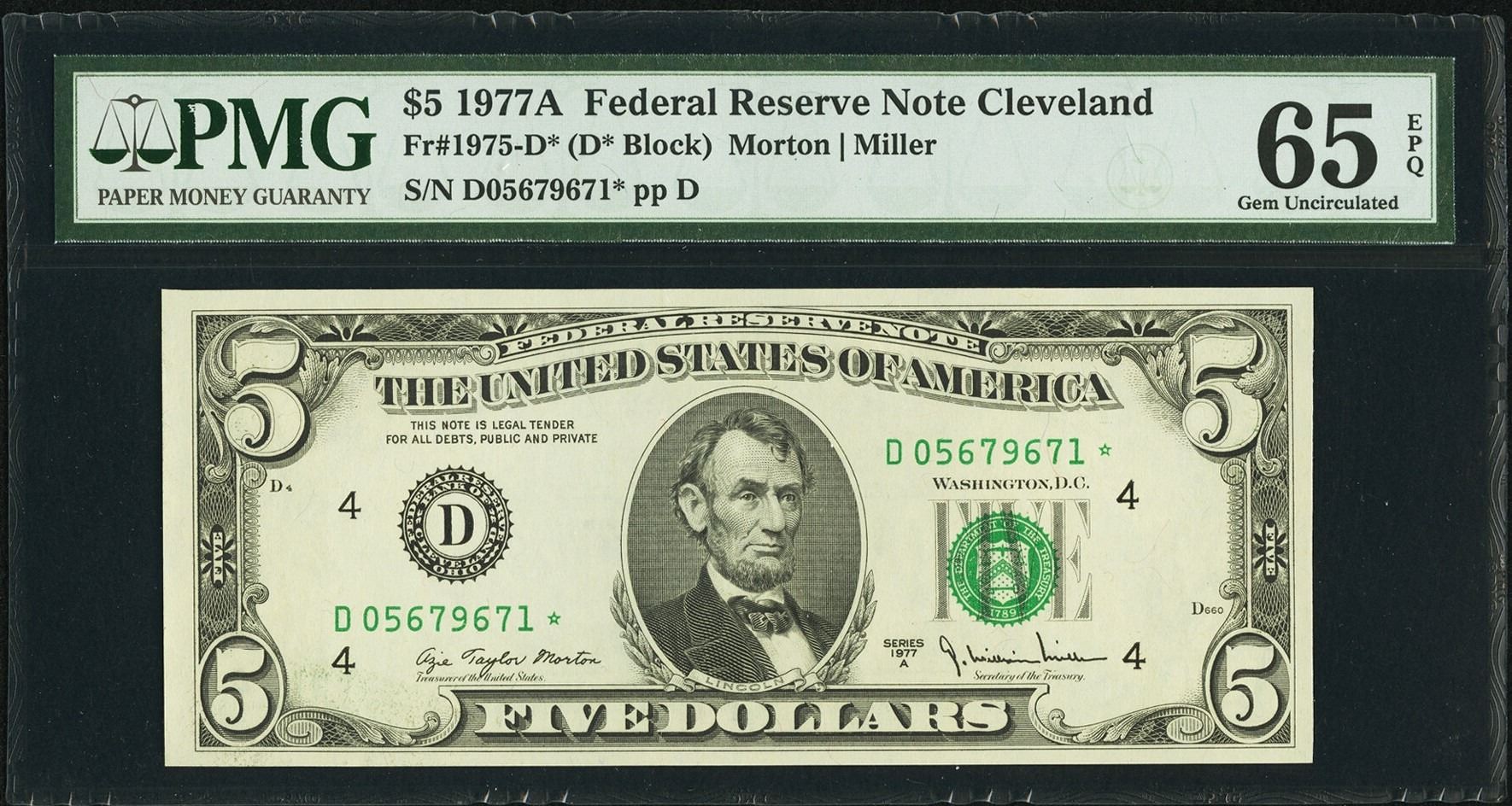 One 1977A $5 Cleveland Federal Reserve STAR Note PMG 65EPQ.