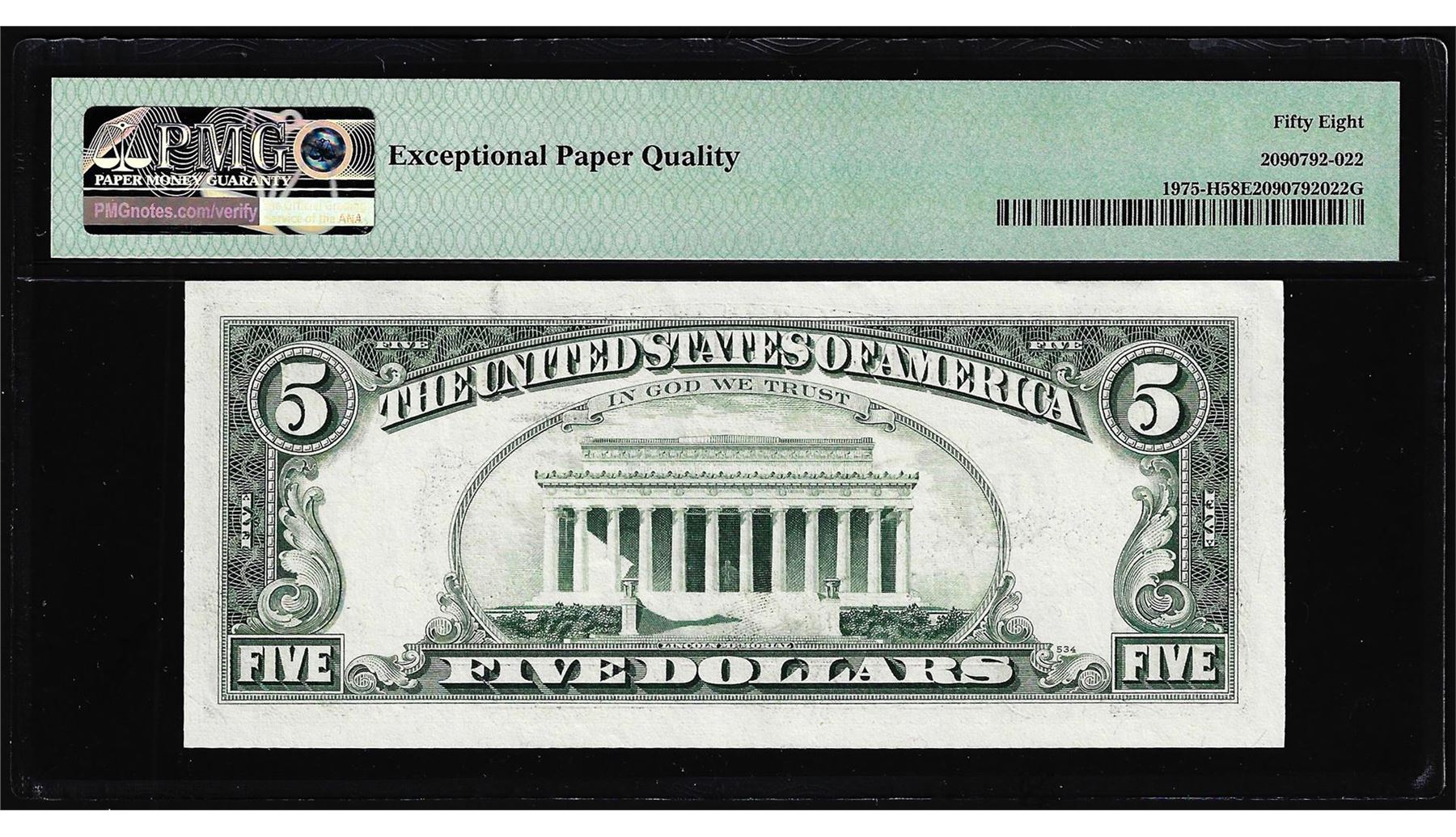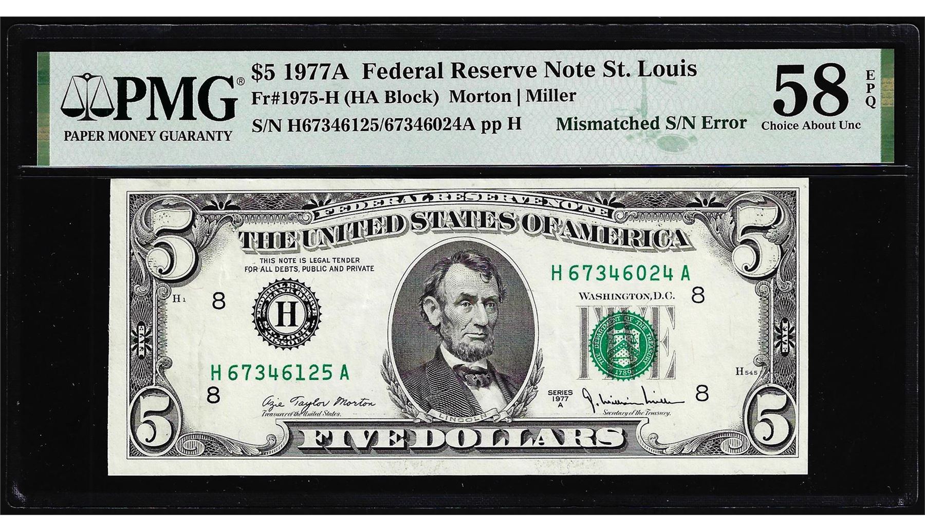One 1977A $5 Federal Reserve Mismatched Serial Number Error Note PMG Ch. About Unc. 58EPQ. PMG Certified.