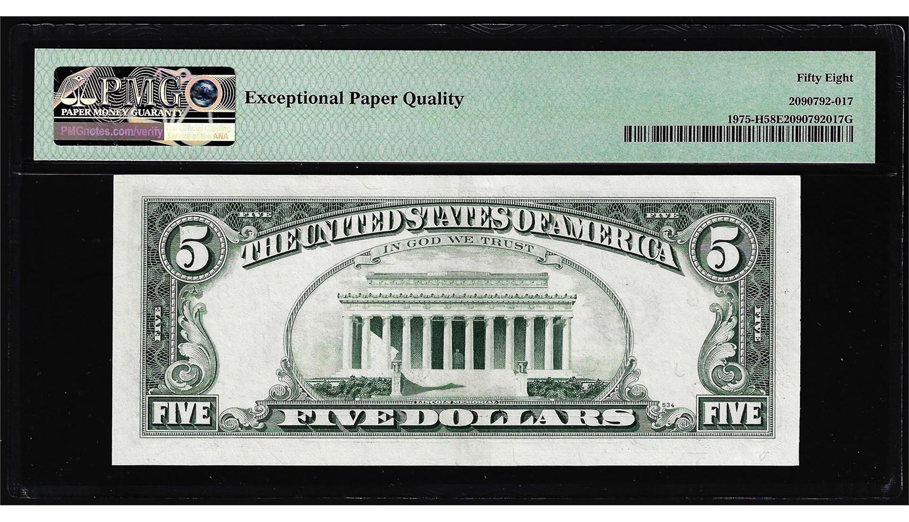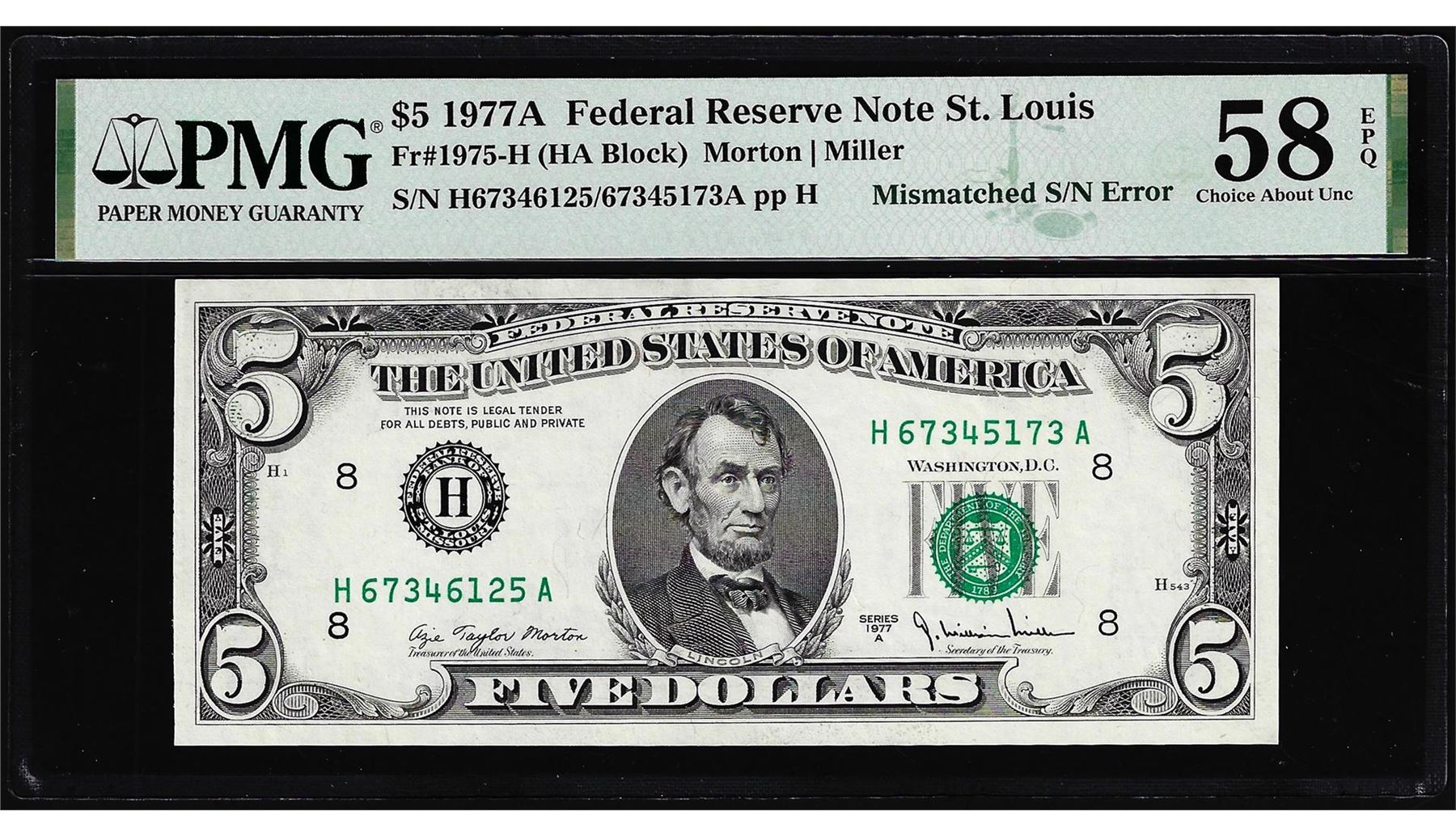 One 1977A $5 Federal Reserve Mismatched Serial Number Error Note PMG Ch. About Unc. 58EPQ. PMG Certified.