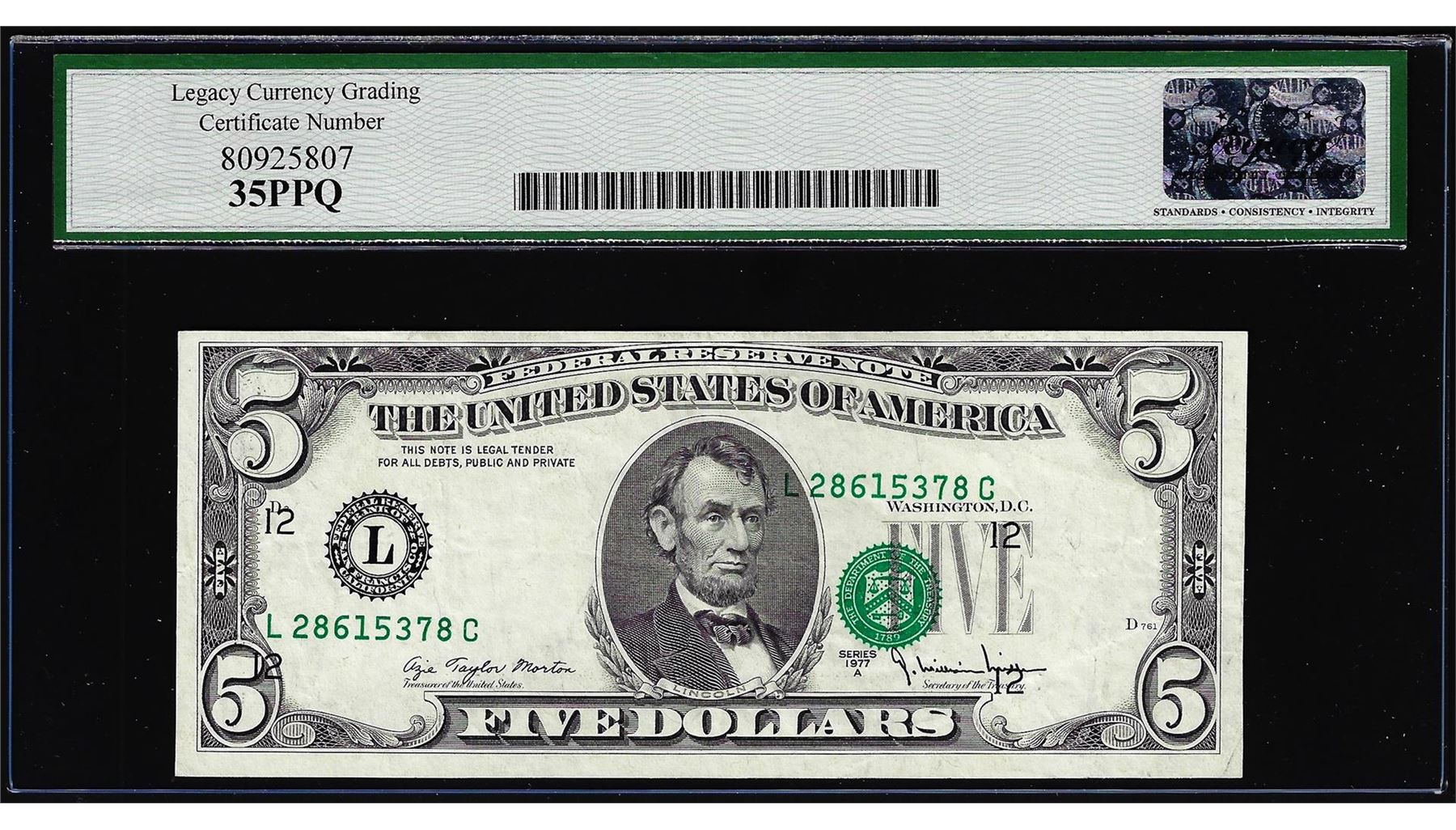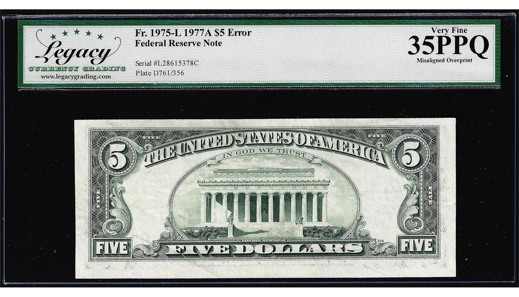 1977A $5 Federal Reserve Note Misaligned Overprint Error Legacy Very Fine 35PPQ