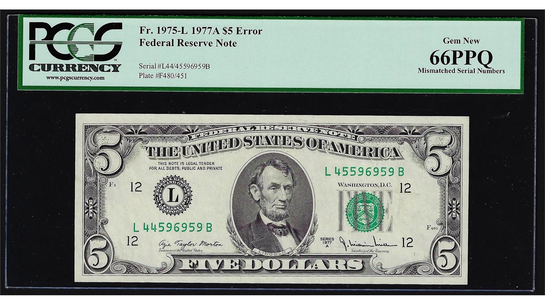 One 1977A $5 Federal Reserve Note Mismatched Serial Number ERROR PCGS Gem New 66PPQ. PCGS Graded.