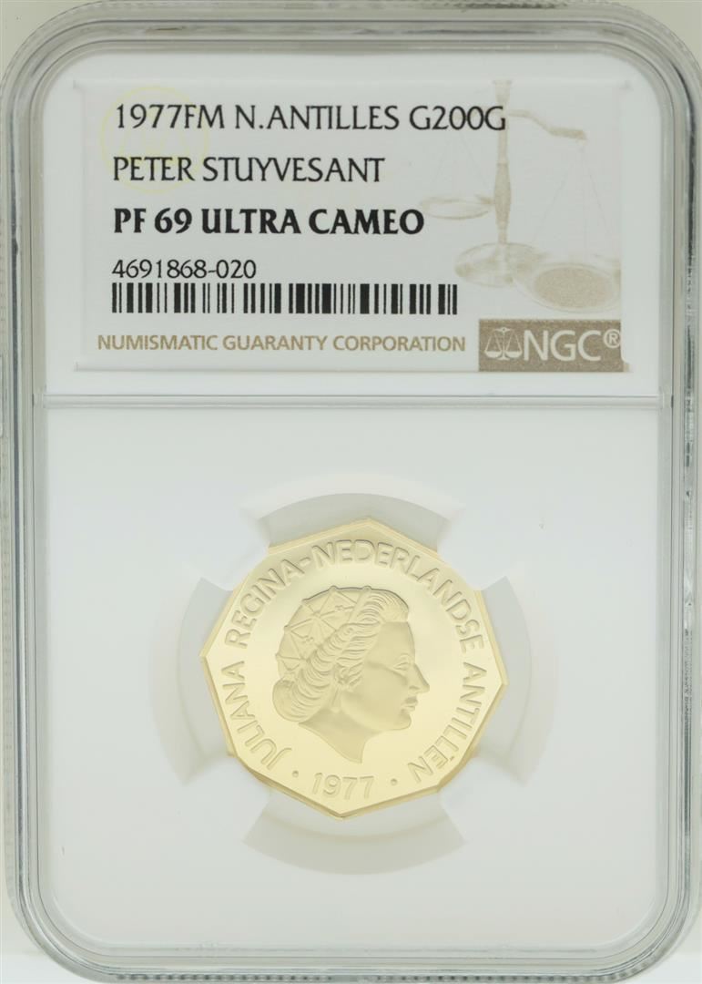 One 1977FM Netherlands Antilles 200 Gulden Stuyvesnt Gold Coin NGC PF69 Ultra Cameo. NGC Certified.