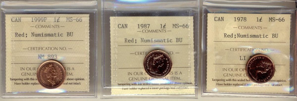 1978 1¢ Num Bu,1987 Num BU, 1999 P, Num BU. Lot of 3 coins all certified ICCS MS66 Full Red