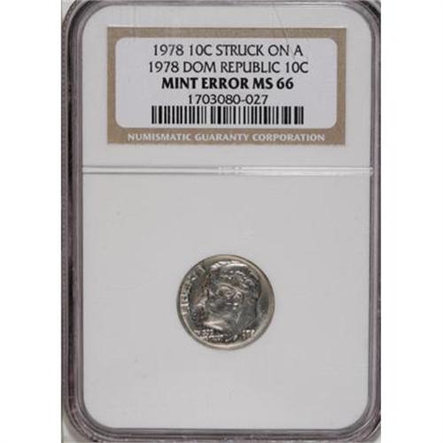 <B>1978 10C Roosevelt Dime--Struck on a Dominican Republic Ten Centavo--MS66 NGC.</B></I> The 8 in the date from the ten centavos (KM-50) strike is evident between the ME in AMERICA. The Dominican Republic coat of arms is extensively perceptible throughout Roosevelt's portrait. This satiny and untoned example is well centered and exhibits virtually the entire design of the overtype. Lustrous and desirable.<BR><BR><B>Coin Engraver:</B> John R. Sinnock<BR><BR><b>Shipping:</b> Coins & Currency (<a target="_blank" href="http://www.heritageauctions.com/common/shipping.php">view shipping information</a>)