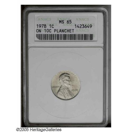 1978 1C MS65 Brown ANACS. 1978[1C] Lincoln Cent--Struck on a Dime Planchet--MS65 ANACS.